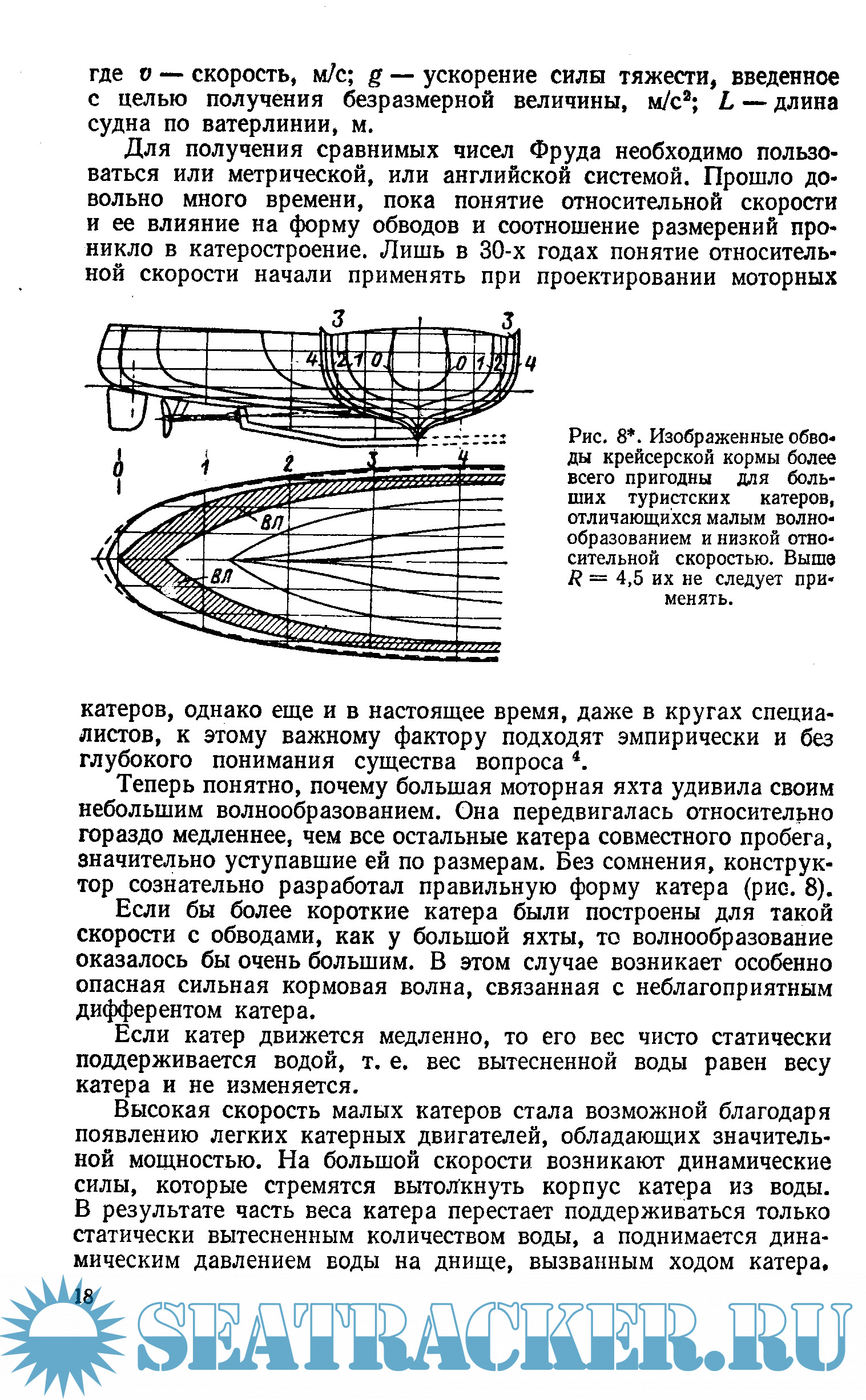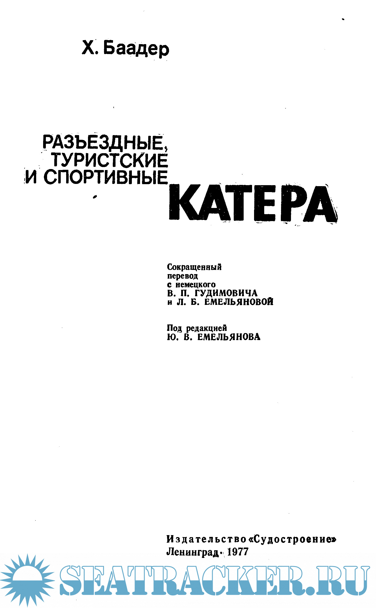 В Новая книга Х. Баадера не представляет собой общего си-стематизированного руководства по проектированию катеров, поскольку в ней не отражены, например, вопросы прочности, конструкции отдельных элементов. Сена не является и популяр¬ным руководством для любителей, строящих своими силами туристские или спортивные катера. Тем не менее разнообразие фактического материала делает ее интересной для широкого круга советских специалистов, работающих над созданием мало¬тоннажных моторных судов различных типов, главным образом разъездных, туристских и спортивных, переводе частично сохранены данные о больших морских моторных яхтах.