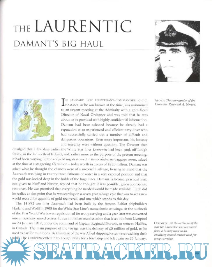 Description: The book tells the fascinating story of fortunes lost sometime in the history of mankind and later found. The book explores the fate of 17 individual ships that were selected among others for their historic importance, the scientific innovation behind their discovery, the personal tragedies that befell the people involved, and the glamour of the extraordinary wealth that they may have once contained. The book also includes detailed maps show the resting location of more than 170 ships, including the Titanic and the Lusitania.