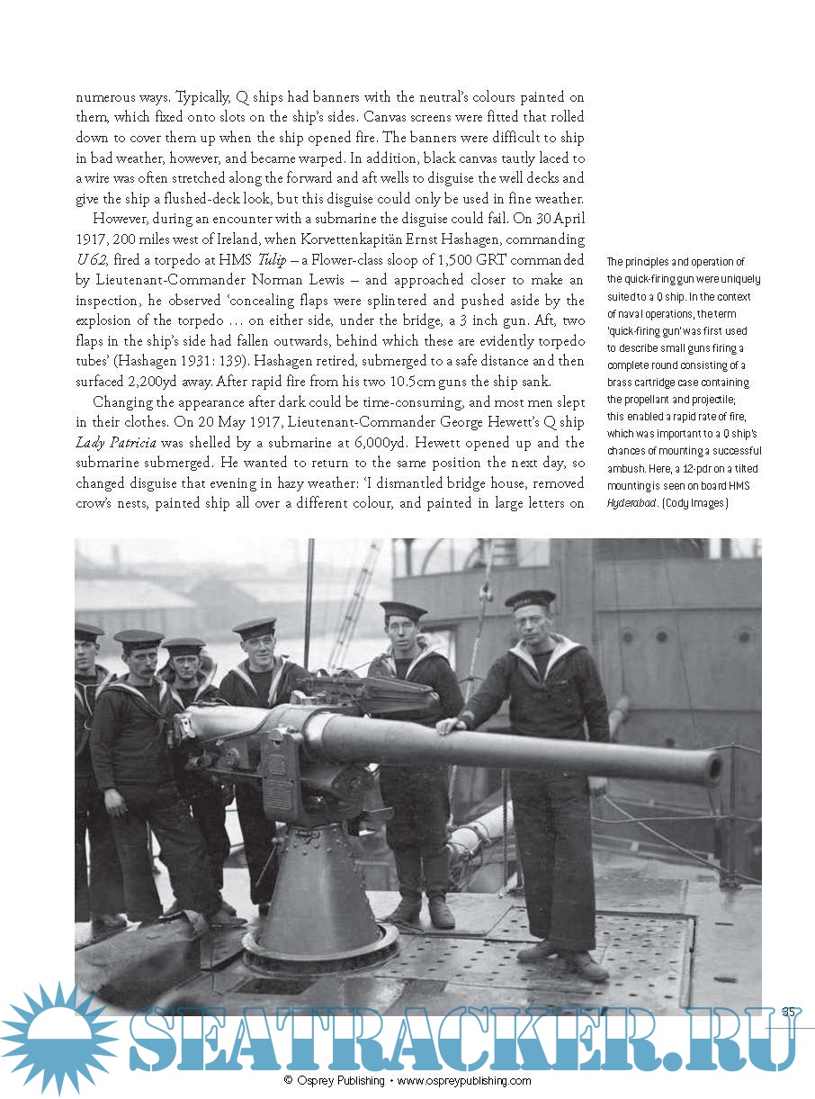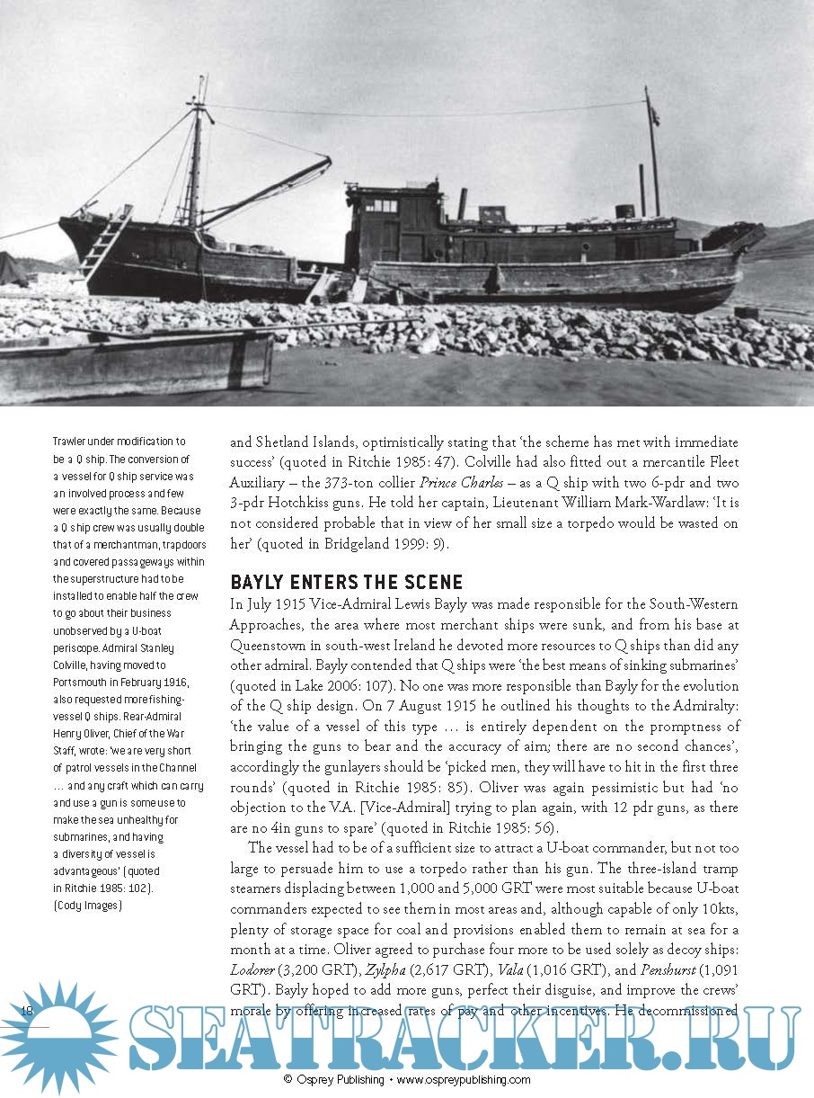 Description: Q ships came in all shapes and sizes – coastal steamer, trawler, barque, yacht or schooner – but all had to look harmless in order to lure their opponents to the surface and encourage them to attack. Armaments differed according to ship size; steamers commonly had 4in guns mounted amidships and in the bow, trawlers 3-pdrs and sailing ships 12-pdrs. Those who served on Q ships had to accept that their U-boat opponents would be able to strike first. Q ship captains kept ready a 'panic crew', which was trained to act out an elaborate evacuation to convince the U-boat commander that the ship was being abandoned by its crew. The Q ship captain would remain behind with a handful of other crewmen manning the guns, which remained hidden until the most opportune time to unmask and engage the U-boat. The Q ship concept had emerged early in the war when no other method seemed likely to counter the U-boat threat, and flourished until new technologies and tactics were developed, tested and implemented.