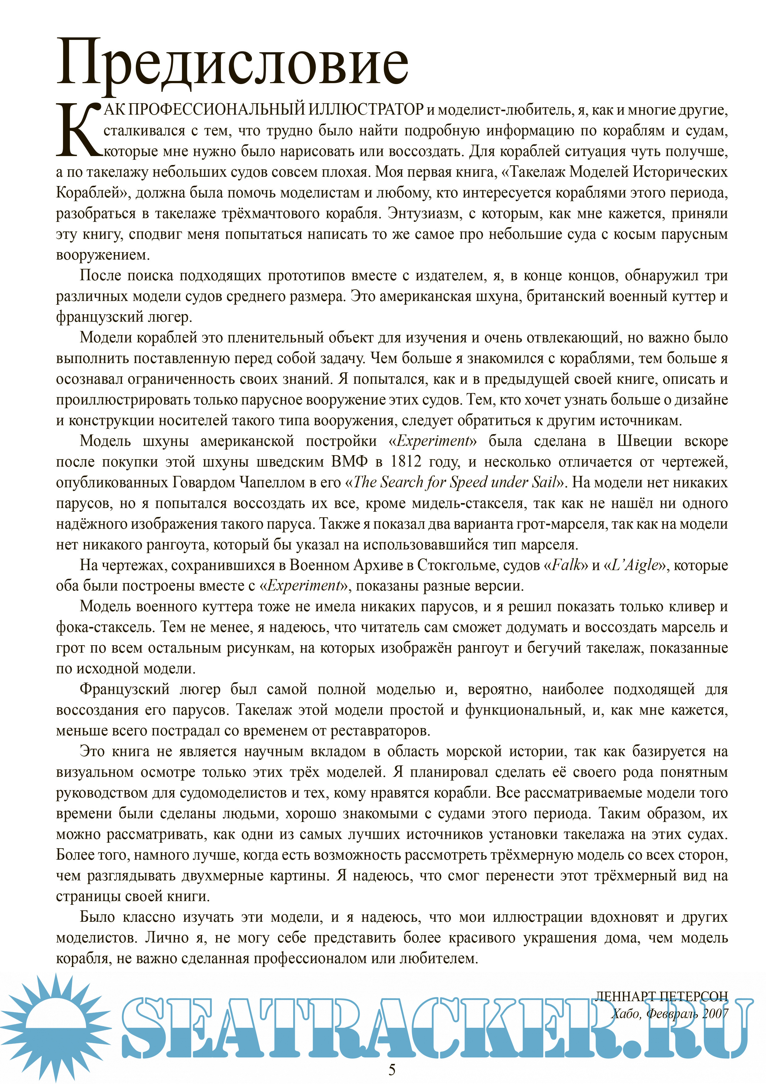 Год выпуска: 2007 Язык: Русский, Английский Автор: Леннарт Петерсон/Lennarth Petersson. Перевод Андрея Баитова Жанр: Руководство для судомоделистов и тех, кому нравятся корабли. Издательство: Naval Institute Press/Чуланчик-на-Верфи ISBN: 1591147212 Формат: PDF Качество: Изначально компьютерное (eBook) Количество страниц: 112 Описание: На великолепных и чётких чертежах этой книги показана каждая деталь такелажа судов с косым парусным вооружением. Такелаж моделей исторических кораблей, является, вероятно, самой сложной работой, с которой сталкивается моделист. Первая книга автора «Такелаж моделей исторических кораблей» очень помогла тем, кто желал разобраться в прямом парусном вооружении, а эта новая книга должна помочь в изучении косого парусного вооружения. В ней показаны три типичных для восемнадцатого века судна - английский куттер, трёхмачтовый французский люгер и американская шхуна. Приблизительно на 200 рисунках чётко показано, где крепится каждая снасть стоячего и бегучего такелажа, куда идёт и где укладывается. Нужно ли моделисту оснастить такелажем весь корабль или нужна информация по какому-то определённому вопросу, всё он найдёт в этой книге. Эта превосходная работа чётко и удобно раскрывает всю сложность такелажа и понравится любому, кто интересуется такелажем традиционных судов с косым вооружением.