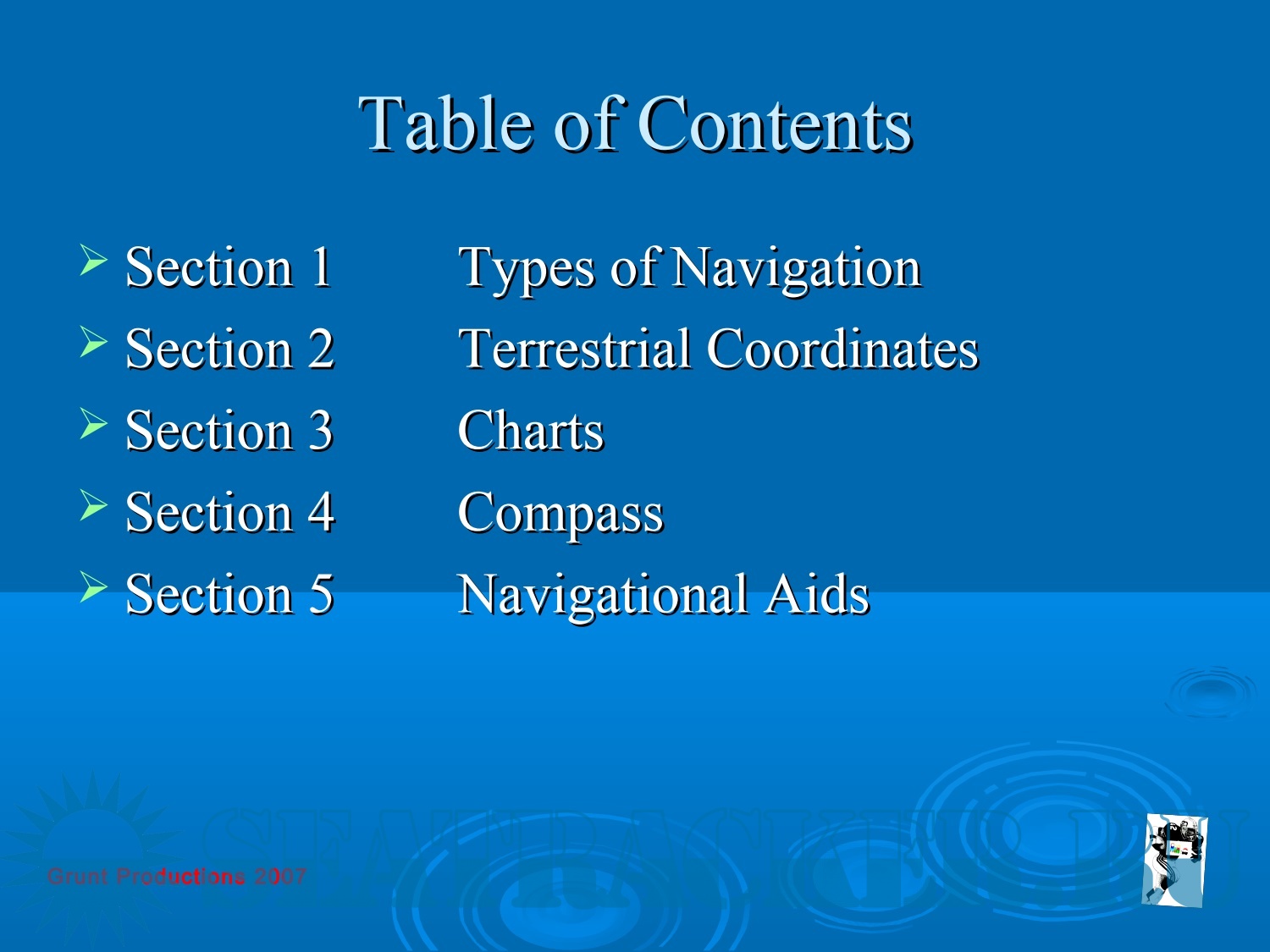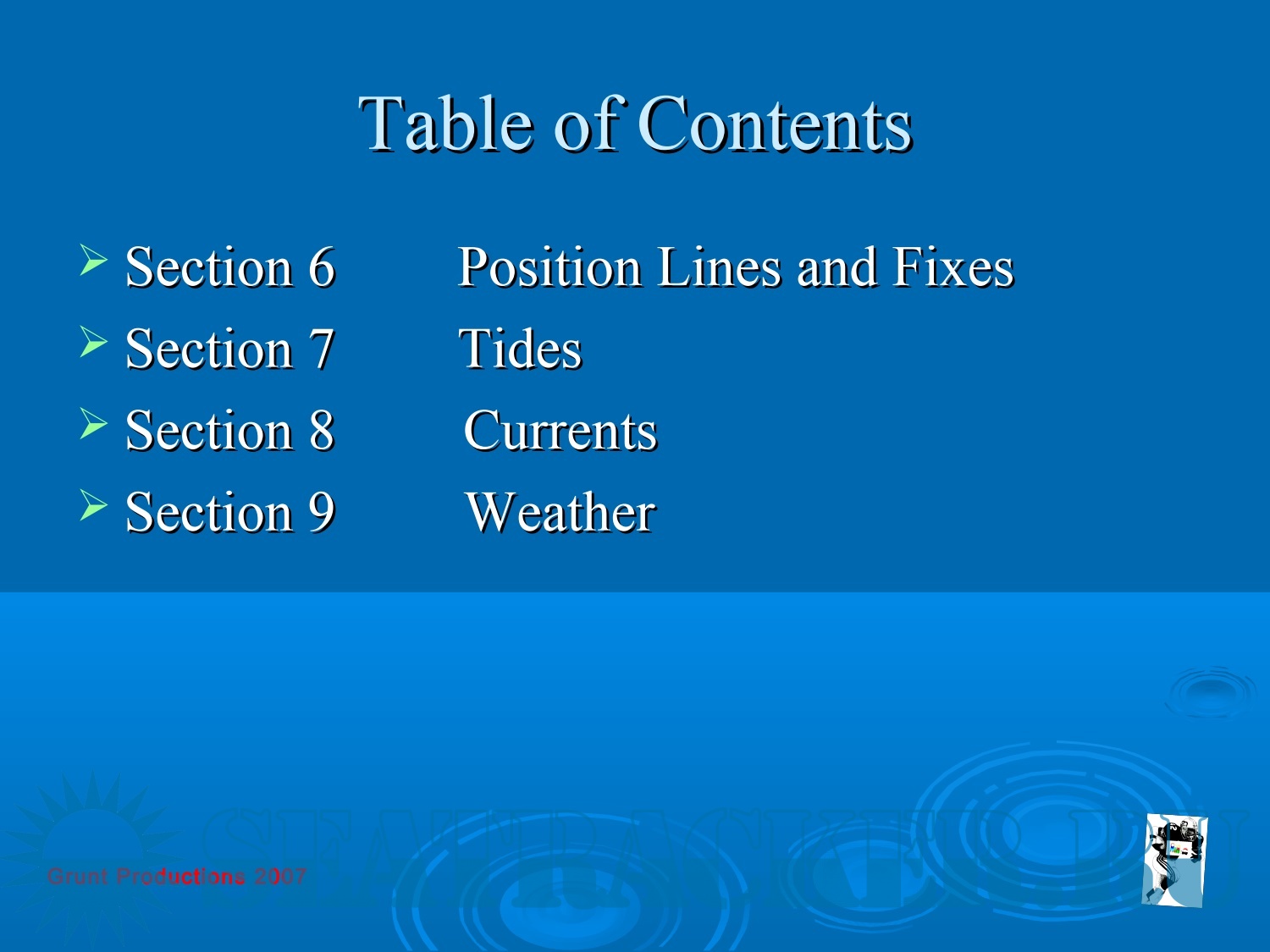 Year: 2007 Language: english Author: Grindley L. Genre: Presentation Publisher: Grunt Productions Format: PDF Quality: Scanned pages Pages count: 231 Description: The purpose of the material is to help people studying the disciplines of navigational faculties understand the science of navigation. It focuses on the practical aspects of navigation and explains the meaning of the actions. The material contains, in addition to special navigational knowledge, useful advice for a young navigator from other branches of marine life and, in principle, will be of interest not only to students and cadets, but also to experienced sailors.
