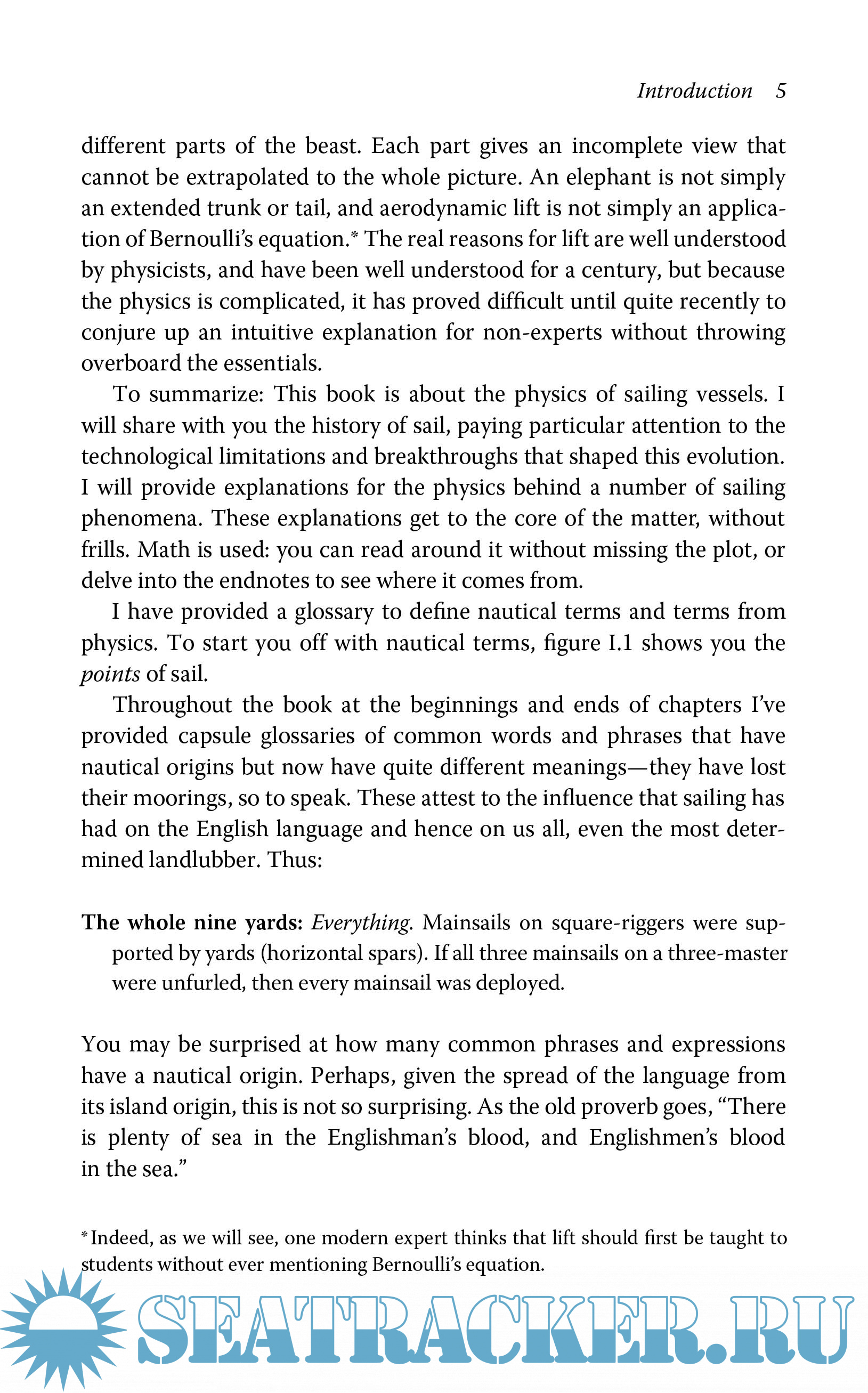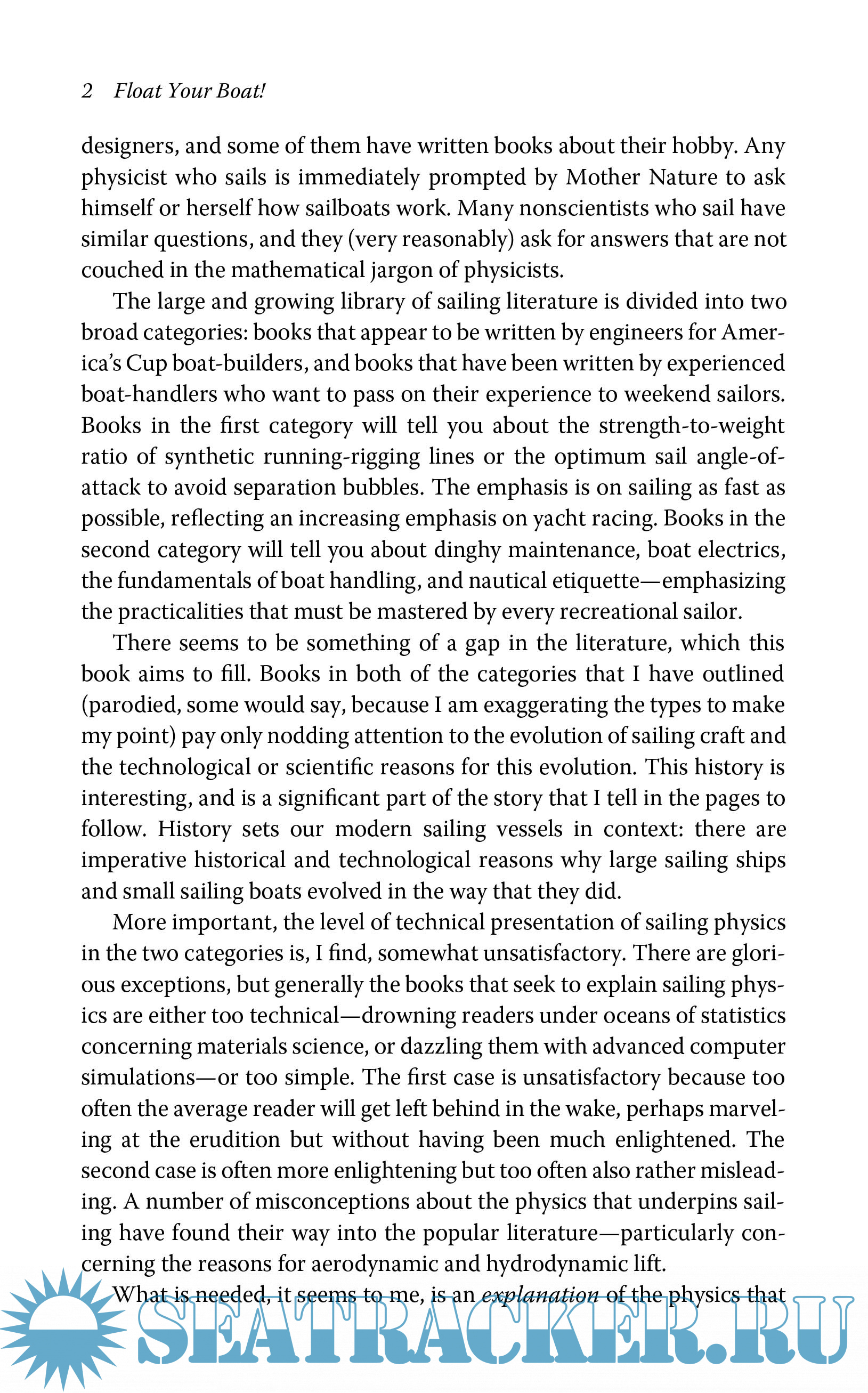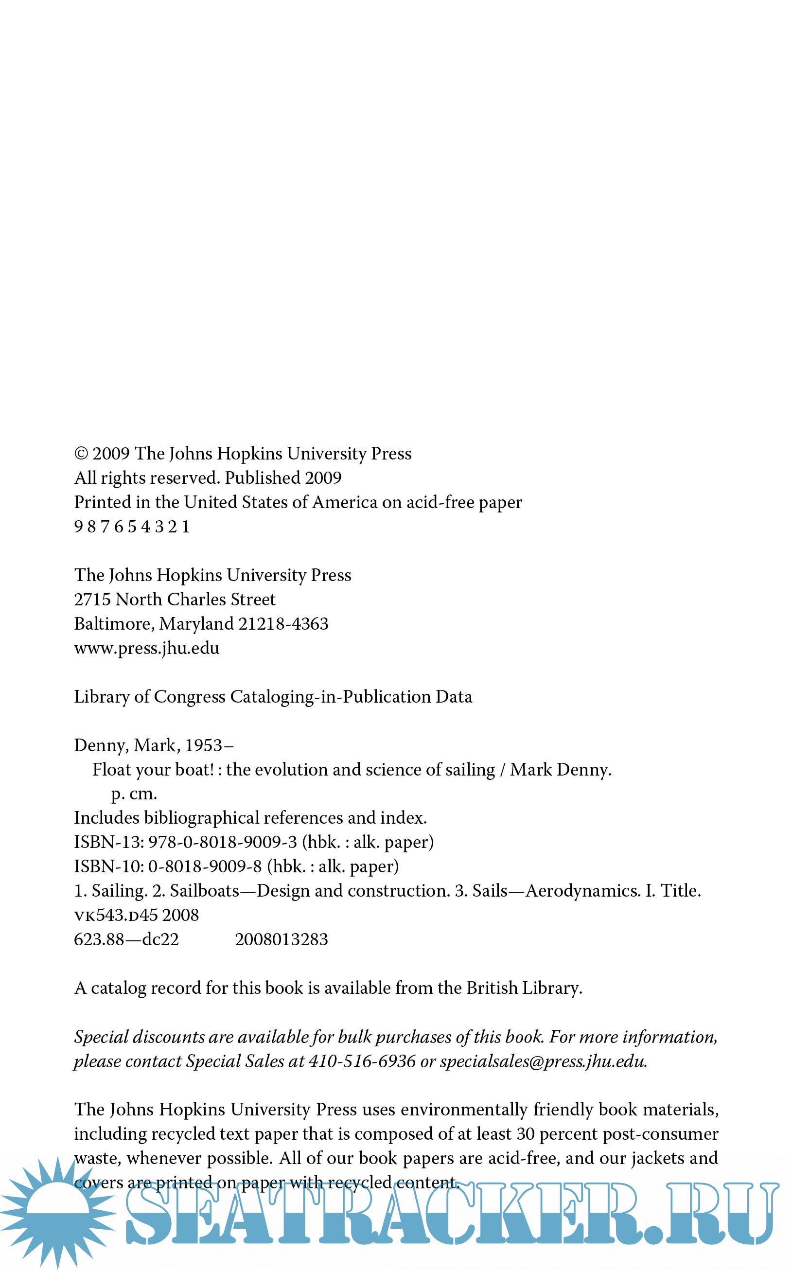 Year: 2009 Language: english Author: Mark Denny Genre: Other Publisher: The Johns Hopkins University Press ISBN: 978-0-8018-9009-3 Format: PDF Quality: eBook Pages count: 275 Description: An estimated 4.1 million people in the United States participate in recreational sailing. Yet the large library of sailing literature leaves many of them high and dry. On one side are technical guides for America’s Cup boat-builders; on the other, simplistic books for weekend sailors with little interest in science. In Float Your Boat! professional and amateur boaters alike will find intelligent and understandable answers to such questions as: What were the key innovations that made sailboats more efficient? How do you increase the speed of a boat? How do sailboats travel into the wind? Why are so many explanations of sailing so wrong? Sailing enthusiast and physicist Mark Denny first traces the evolution of the sailing craft, from prehistoric coracles made of animal skins and antlers to the sailboat’s reinvention as a pleasure craft during the Industrial Revolution. He then identifies specific sailing phenomena?how wind drives modern Bermuda sloops, how torque determines stability, why hull speed exists?and provides the key physics principles behind them. Whether you are an inquisitive landlubber who has never set foot in a boat, a casual weekend sailor, or an old salt who lives for the sea, Float Your Boat! is an accessible guide to the physics of sailing. PS See my other releases in the "Yachting, sailing, boating" topic: https://seatracker.club/tracker.p...id=54420#results