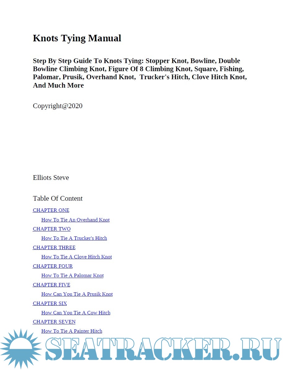 Description: This handbook is a step by step guide to knots tying. Each chapter is dedicated to a specific knot, for which an illustrated step sequence is given. Photograps and/or drawings, plus a brief text explains how a kont is started, continued and finally completed. Most important, a picture shows the final appearance of the tight knot. Topics cover, among others, Stopper Knot, Bowline, Double Bowline Climbing Knot, Figure 8, Square, Fishing, Palomar, Prusik, Overhand Knot, Clove Hitch Knot, among others.