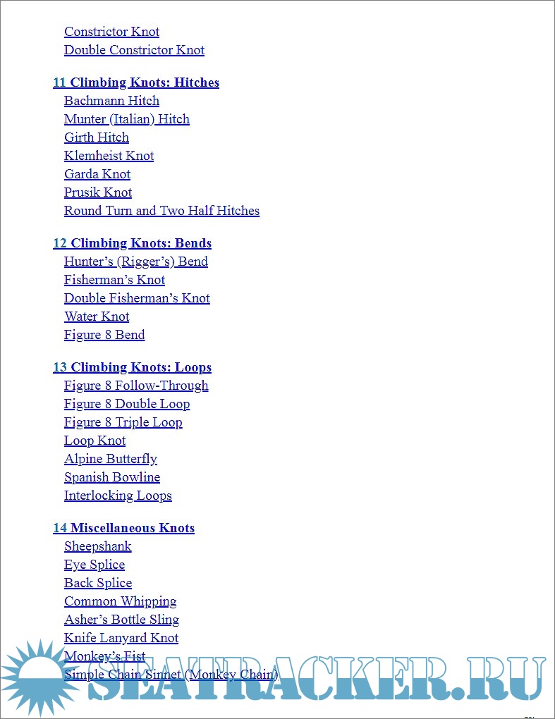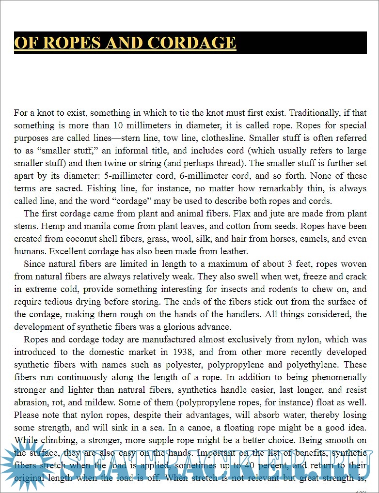 Year: 2019 Language: english Author: Buck Tilton Genre: Manual Publisher: Falcon Guides Edition: 2nd ISBN: 978-1-4930-4798-7 Format: EPUB Quality: eBook Pages count: n/a Description: The author, a recognized authority in the field of ropes, lines and knots, aims to give the reader a fool-proof guide to essential rope skills, trying to made knot-making simple and fun. The book is a guide to using knots in reader's favorite outdoor activities, through step-by-step instructions and detailed photographs. An introduction deals with basic terminology, tying tips, and ropes manufactoring and structure. Rope strenght is compared to knot strenght, approaching the safety argument. Marine and boat knots have separate chapters, but the whole book is extremely interesting to anyone who deals with ropes, lines, hitches, knots, bends and rigging.