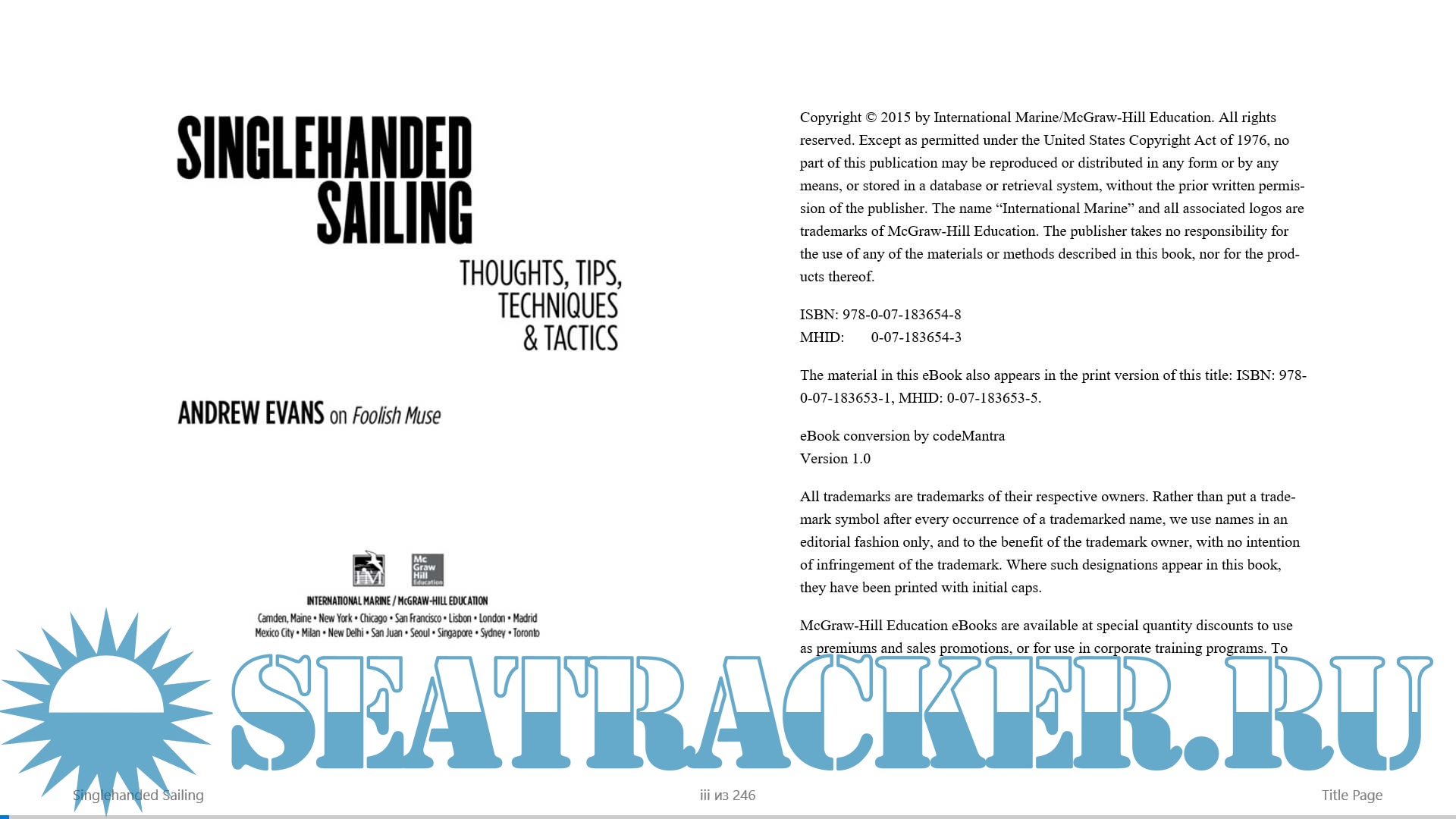 Year: 2015 Language: english Author: Andrew Evans Genre: Guide Publisher: McGraw-Hill Education ISBN: 978-0-07-183654-8 Format: EPUB Quality: eBook Pages count: 246 (depends upon the screen resolution) Description: "It takes thousands of hours of sailing to get the kind of knowledge contained in this book." -- from the Foreword by Bruce Schwab The ONLY bible for how to sail your boat fast, safe, and alone Solo sailing is within any sailor's grasp with a little forethought--and this essential guide. Got a 35-foot sailboat? No problem. Is the wind blowing 20 knots? No problem. Are you racing offshore overnight? Even better. Singlehander Andrew Evans learned the hard way how to sail and race alone--with lots of mishaps, including broaches and a near tumbling over a waterfall--and in Singlehanded Sailing he shares the techniques, tips, and tactics he has developed to make his solo sailing adventures safe and enriching. PS See my other releases: https://seatracker.club/tracker.p...id=54420#results