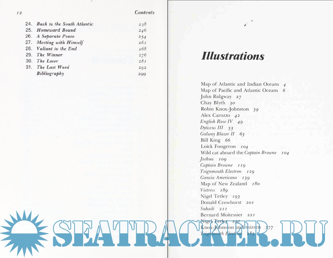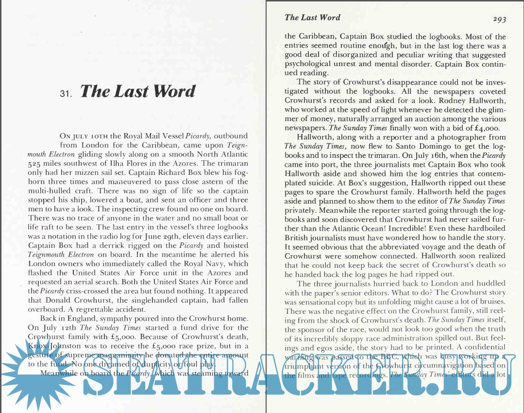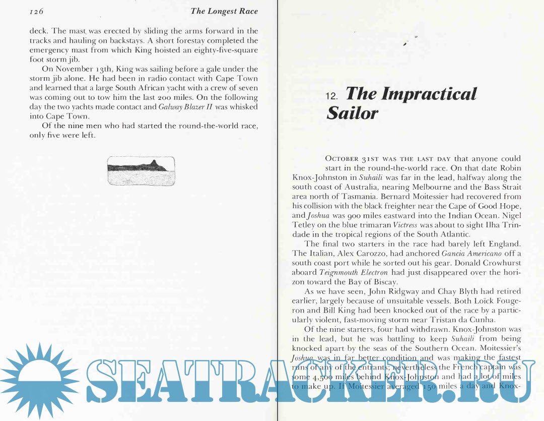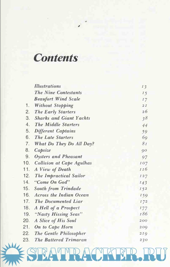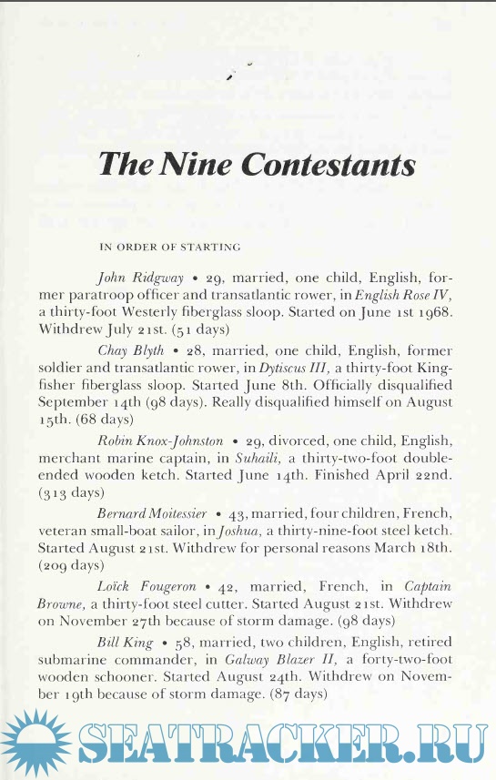 Hal Roth, himself a deep-water sailor and the author of books about his own voyages, has gathered together the whole story of the nine and their adventures. In a masterful display of narrative skill, he involves the reader in each story. We experience the agony of Donald Crowhurst, who was emotionally and physically unprepared for the voyage and who, in desperation, made a decision that destroyed him. We are with Robin Knox-Johnston, holding together a slowly disintegrating boat, fighting through storms and calms, able to live alone for months, and finally staggering back into Plymouth, the winner and only finisher. We live with the nearly mysterious Bernard Moitessier, a superb sailor who, when nearly three-quarters of the way around the world, suddenly turned around and returned to French Polynesia, where he lived for eleven years.