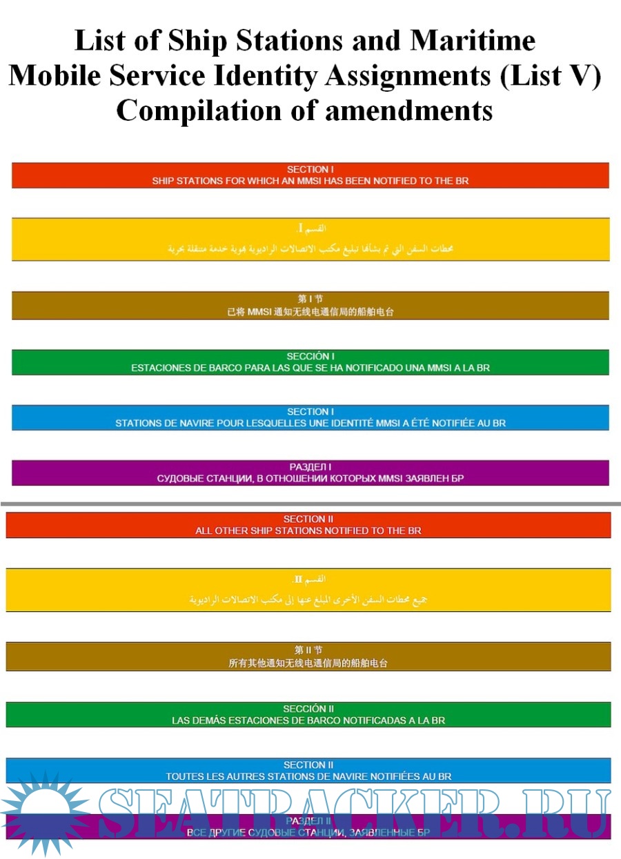 Description: The List of Ship Stations and Maritime Mobile Service Identity Assignments (List V) is a service publication containing data collected from Administrations and published, once a year, in accordance with Radio Regulations (RR). The List is to provided to all ship stations for which a Global Maritime Distress and Safety System (GMDSS) installation is mandatory.
