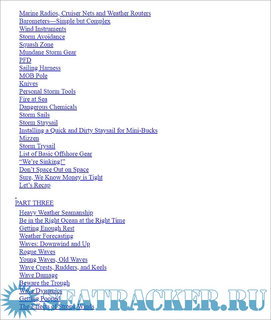 Year: 2016 Language: english Author: Gary M. Goodlander Genre: Manual Publisher: Self Published ISBN: 1533352720 Format: Other Quality: eBook Pages count: 338 Description: As author remarks "Storms exist. Pretending they don’t or that they will never hit you is both stupid and childish". The purpose of this book is not to encourage ayone to sail into storms, but rather to assist reasonably experienced sailors to survive storms with minimal damage to vessel and crew. Since not all storms can be avoided, the sailor must be properly prepared, instead of fear them. There’s only one way to obtain this offshore calm and self-confidence. It is called seamanship, or common sense based upon experience. It cannot be purchased. Seamanship must be earned over time, and the more seamanship one has, the less fear suffers. A little fear can be useful, but too much can paralyze. The base idea of the book is that a good boat is obviously better than a bad one, but there is no direct relationship between cost and safety. A small, storm-proofed boat can be safer than a large, expensive yacht. In this book the author widely dispenses tips, tricks and rules to make safer the existing boat. Advices covers everything the offshore sailor needs to know about vessel preparation, reducing sail, reefing, towing slowing drogues, deploying a parachute-type sea anchor, from where to step into a life raft, why deploy fenders, what things one must avoid, and ultimately, hanging to a Jordan Series Drogue. Additional info: Folder contains both AZW3 and epub version of the book