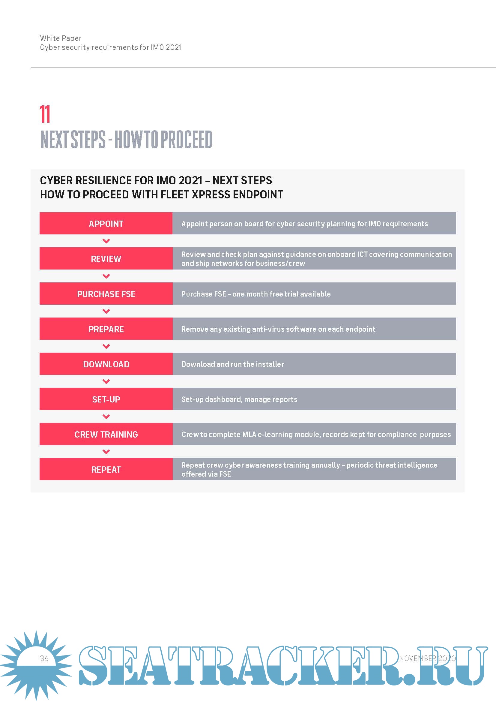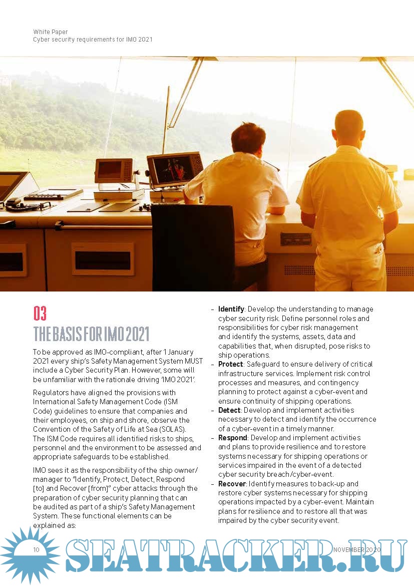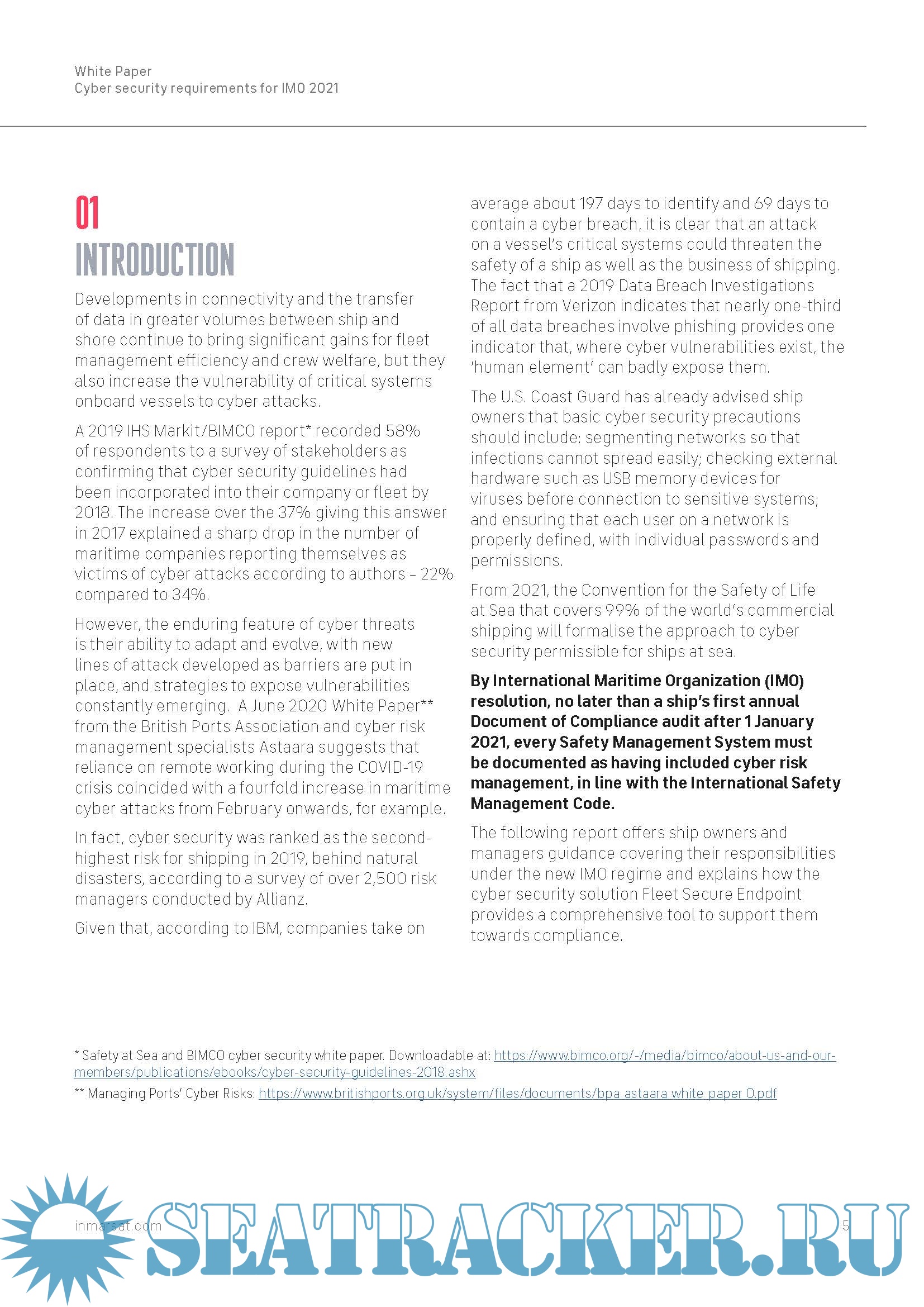 Year: 2020 Language: english Author: INMARSAT Genre: Guide Publisher: INMARSAT Format: PDF Quality: eBook Pages count: 38 Description: Developments in connectivity and the transfer of data in greater volumes between ship and shore continue to bring significant gains for fleet management efficiency and crew welfare, but they also increase the vulnerability of critical systems onboard vessels to cyber attacks. By International Maritime Organization (IMO) resolution, no later than a ship's first annual Document of Compliance audit after 1 January 2021, every Safety Management System must be documented as having included cyber risk management, in line with the International Safety Management Code. The following report offers ship owners and managers guidance covering their responsibilities under the new IMO regime.