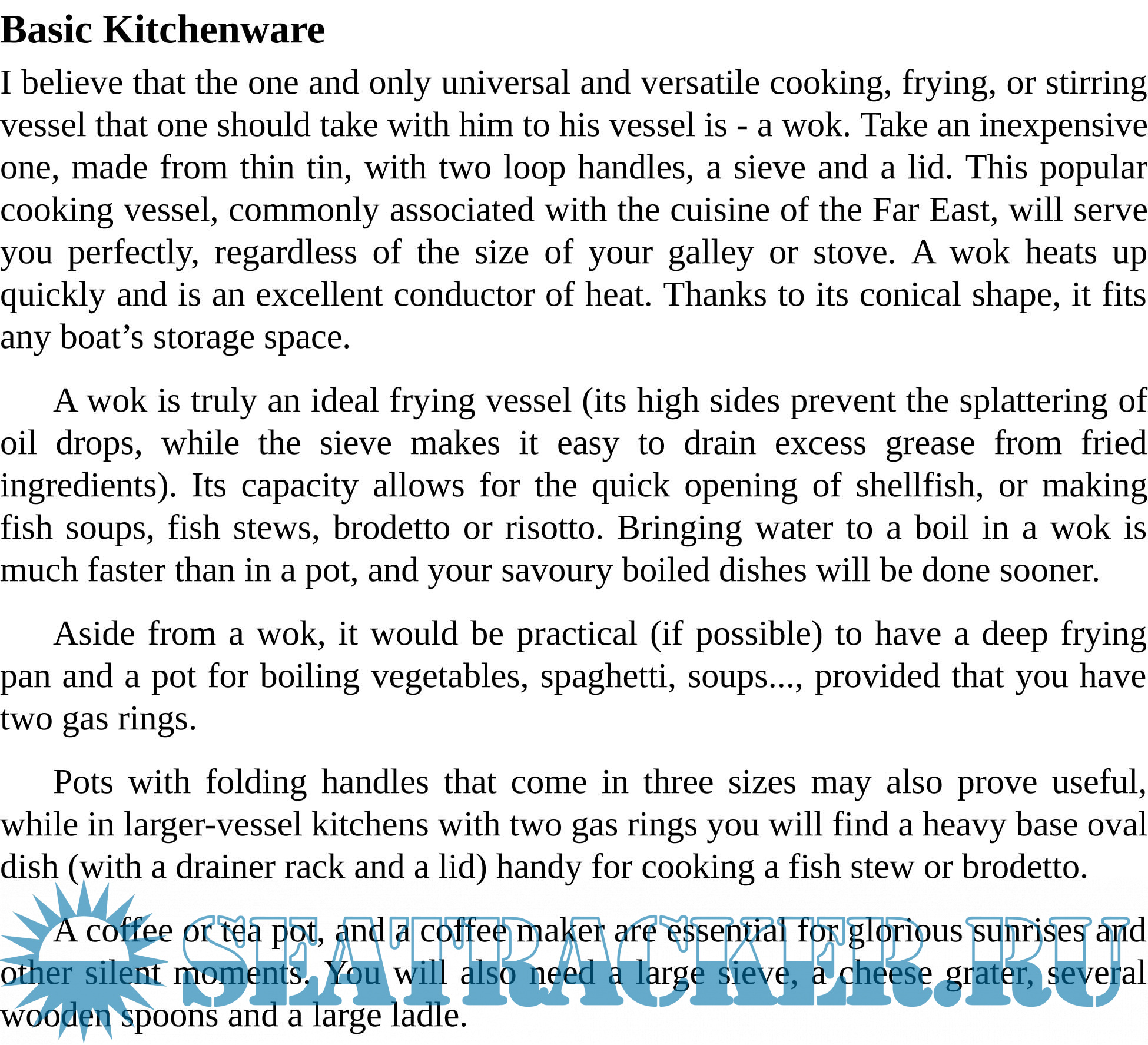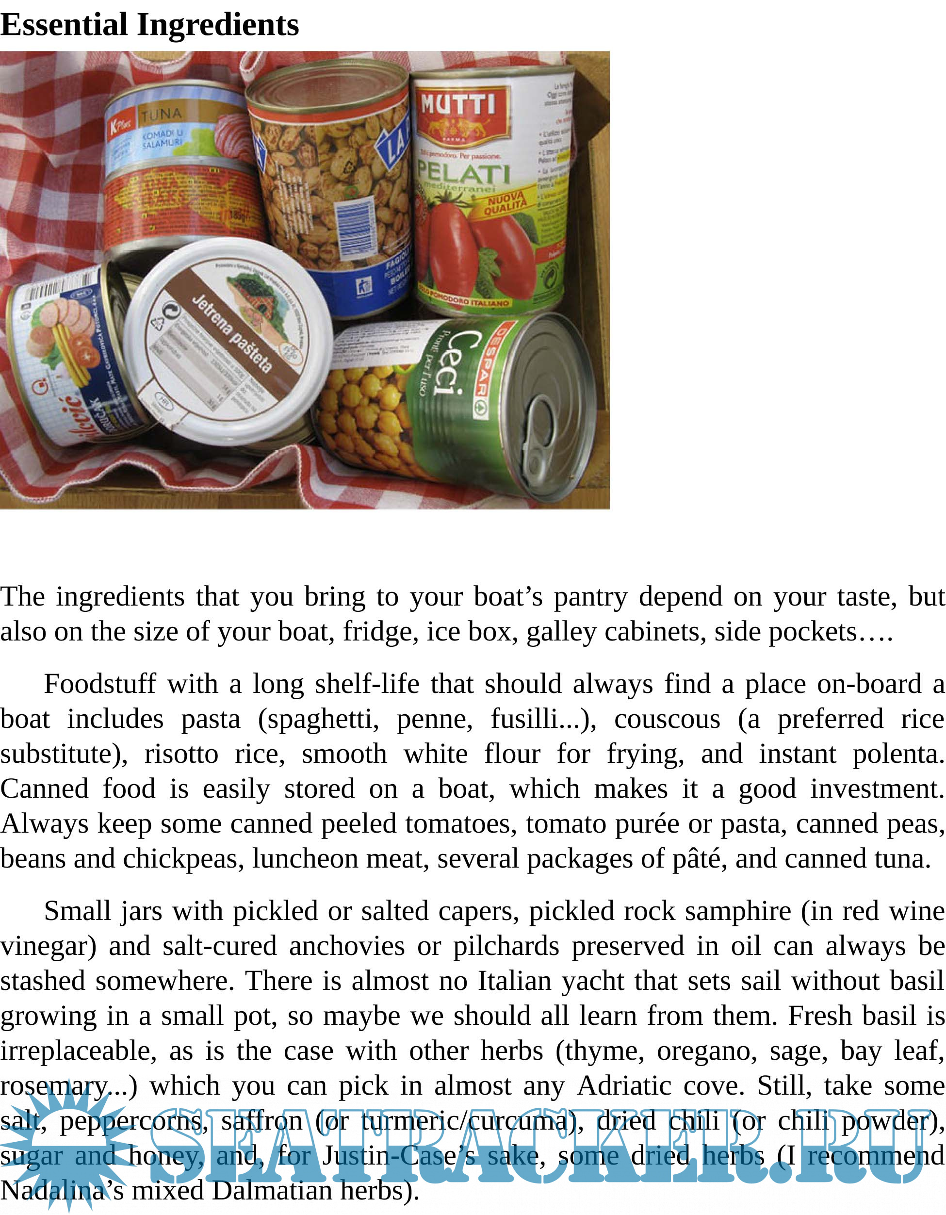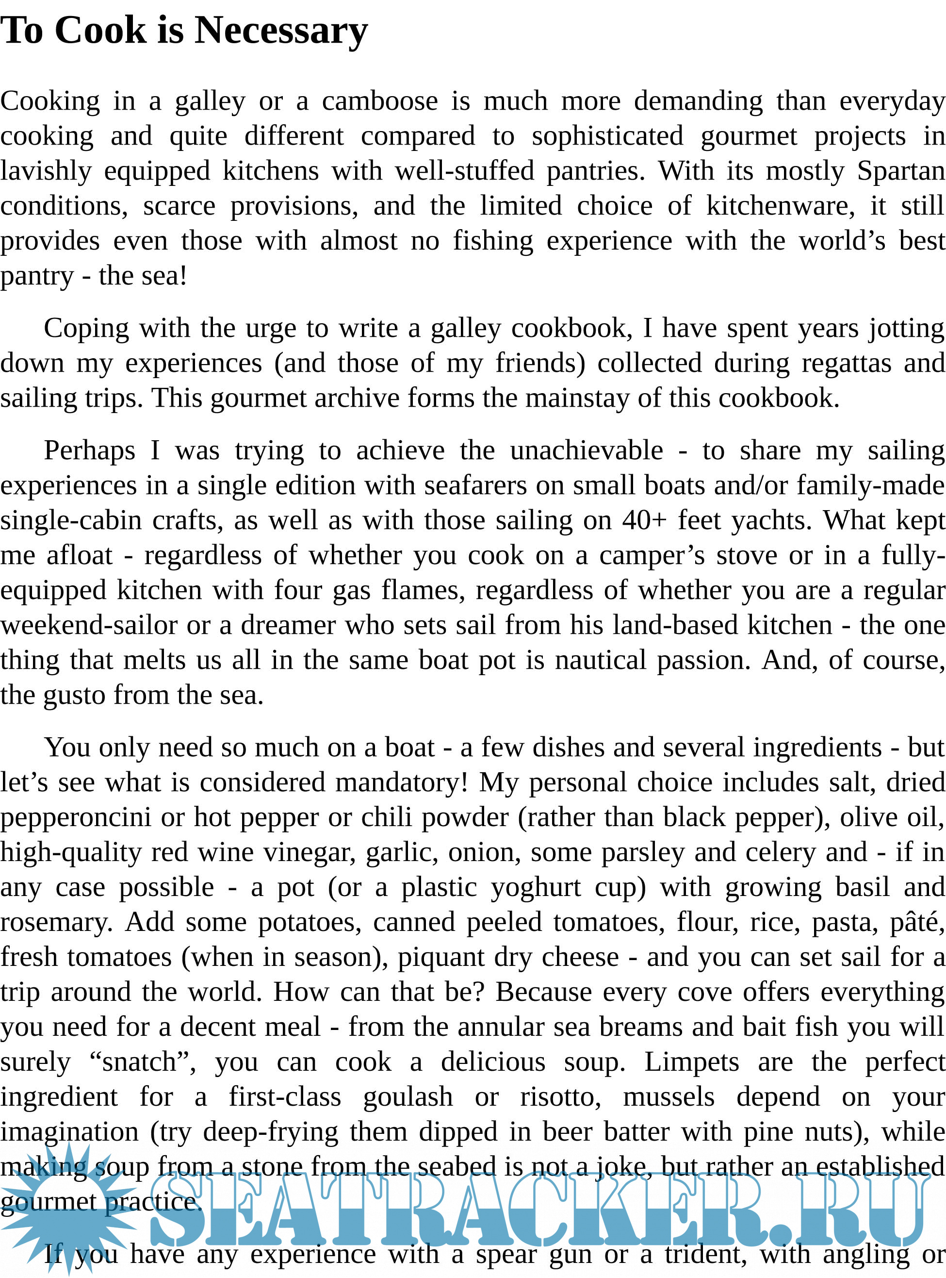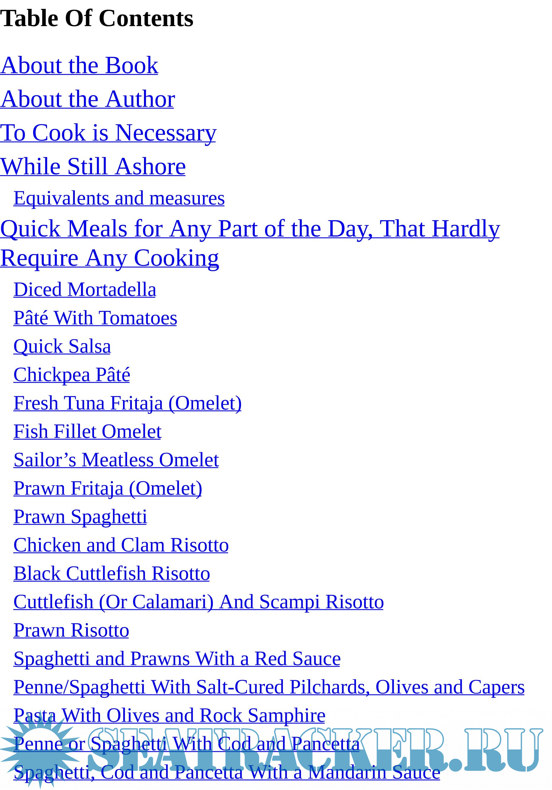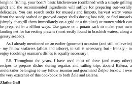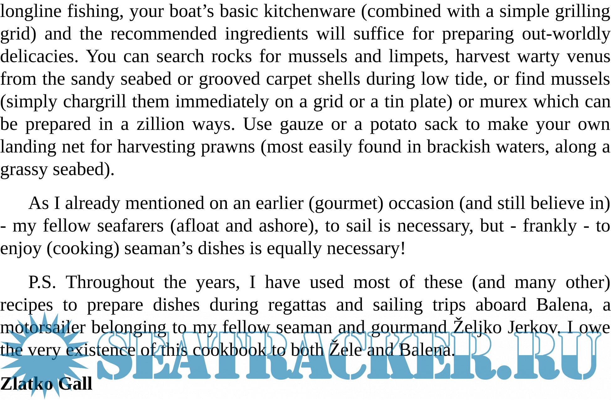 Year: 2015 Language: english Author: Zlatko Gall Genre: Practical guide Publisher: Surogat d.o.o. ISBN: 978-953-57795-4-4 Format: PDF/EPUB/AZW3 (Amazon Kindle format) Quality: eBook Pages count: 273 Description: To Cook is Necessary Cooking in a galley or small sailboat is much more demanding than everyday cooking and quite different compared to sophisticated gourmet projects in lavishly equipped kitchens with well-stuffed pantries. With its mostly Spartan conditions, scarce provisions, and the limited choice of kitchenware, it still provides even those with almost no fishing experience with the world’s best pantry - the sea! Coping with the urge to write a galley cookbook, I have spent years jotting down my experiences (and those of my friends) collected during regattas and sailing trips. This gourmet archive forms the mainstay of this cookbook. Perhaps I was trying to achieve the unachievable - to share my sailing experiences in a single edition with seafarers on small boats and/or family-made single-cabin crafts, as well as with those sailing on 40+ feet yachts. What kept me afloat - regardless of whether you cook on a camper’s stove or in a fully-equipped kitchen with four gas flames, regardless of whether you are a regular weekend-sailor or a dreamer who sets sail from his land-based kitchen - the one thing that melts us all in the same boat pot is nautical passion. And, of course, the gusto from the sea. You only need so much on a boat - a few dishes and several ingredients - but let’s see what is considered mandatory! My personal choice includes salt, dried pepperoncini or hot pepper or chili powder (rather than black pepper), olive oil, high-quality red wine vinegar, garlic, onion, some parsley and celery and - if in any case possible - a pot (or a plastic yoghurt cup) with growing basil and rosemary. Add some potatoes, canned peeled tomatoes, flour, rice, pasta, pate, fresh tomatoes (when in season), piquant dry cheese - and you can set sail for a trip around the world. How can that be? Because every cove offers everything you need for a decent meal - from the annular sea breams and bait fish you will surely “snatch”, you can cook a delicious soup. Limpets are the perfect ingredient for a first-class goulash or risotto, mussels depend on your imagination (try deep-frying them dipped in beer batter with pine nuts), while making soup from a stone from the seabed is not a joke, but rather an established gourmet practice. If you have any experience with a spear gun or a trident, with angling or longline fishing, your boat’s basic kitchenware (combined with a simple grilling grid) and the recommended ingredients will suffice for preparing out-worldly delicacies. You can search rocks for mussels and limpets, harvest warty venus from the sandy seabed or grooved carpet shells during low tide, or find mussels (simply chargrill them immediately on a grid or a tin plate) or murex which can be prepared in a zillion ways. Use gauze or a potato sack to make your own landing net for harvesting prawns (most easily found in brackish waters, along a grassy seabed). Additional info: PDF file was converted from EPUB, so it's highly likely not match to print version ) (If the last one exists))