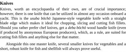 Cooking in a galley or small sailboat is much more demanding than everyday cooking and quite different compared to sophisticated gourmet projects in lavishly equipped kitchens with well-stuffed pantries. With its mostly Spartan conditions, scarce provisions, and the limited choice of kitchenware, it still provides even those with almost no fishing experience with the world’s best pantry - the sea!