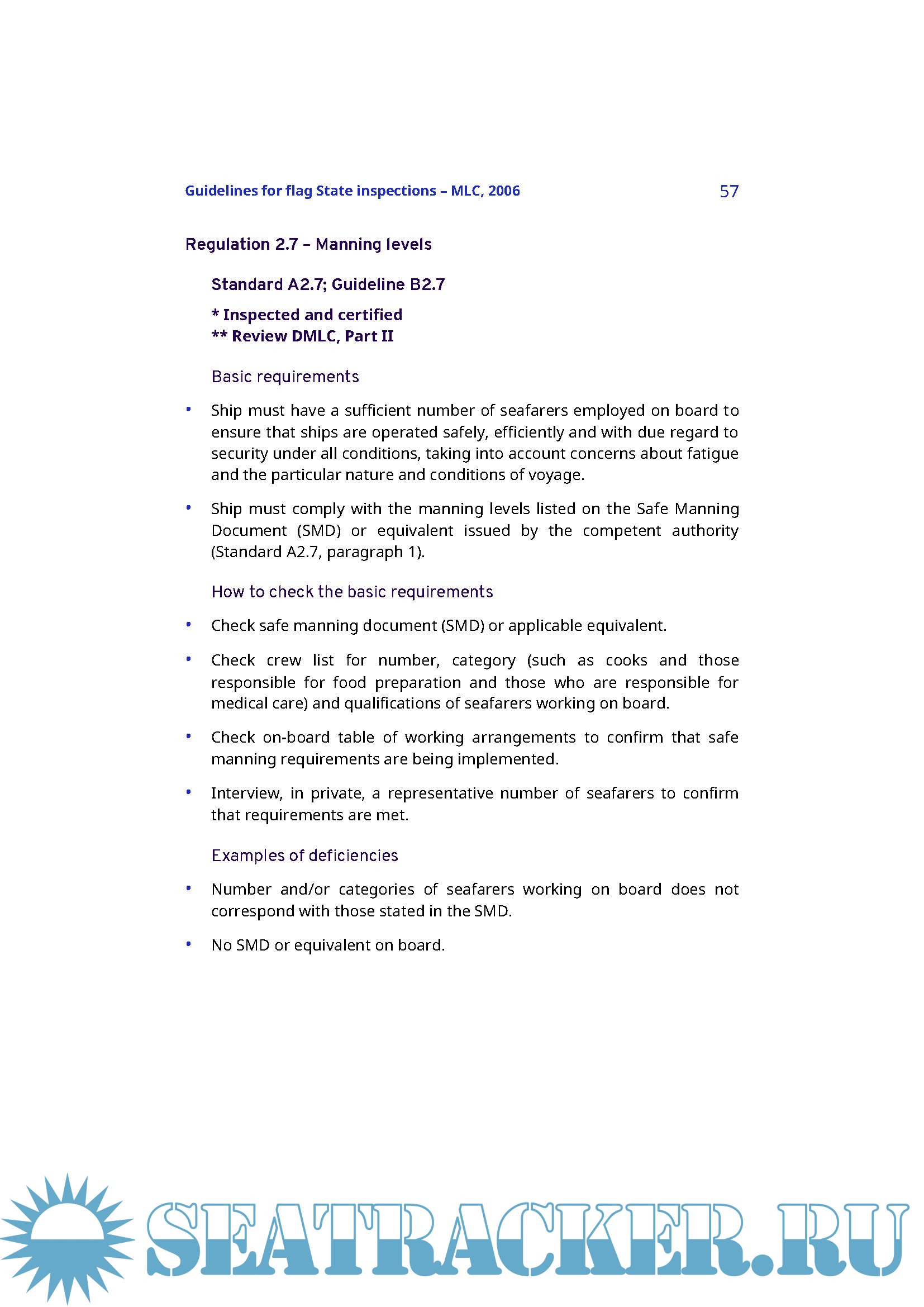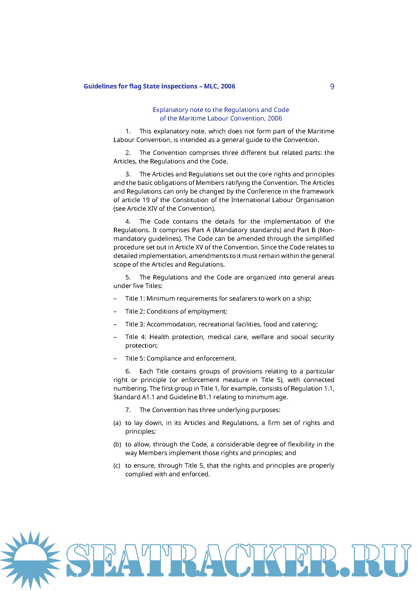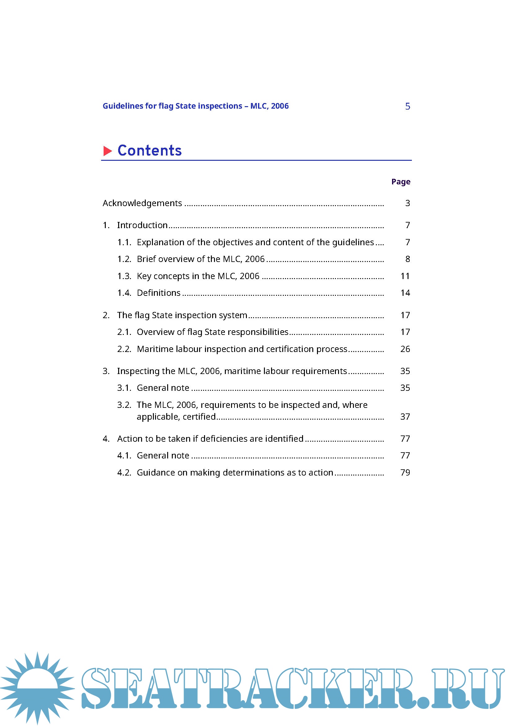 The present Guidelines provide practical advice to competent authorities in flag States and to flag State inspectors, or recognized organizations, on how to carry out ship inspections and certifications to verify compliance with the requirements of the MLC, 2006 as implemented nationally. Chapter 1 contains an overview of the special features of the MLC, 2006 and its key concepts. Chapter 2 provides an overview of the procedures for ship inspection and certification, including areas of national flexibility, and processes for responding to complaints. The main inspection tool is provided by Chapter 3, indicating the basic requirements to be complied with, a list of items showing how to check the basic requirements and examples of deficiencies, in connection with these requirements. Chapter 4 provides guidance on actions to be taken when deficiencies are found and when a ship may have to be detained.