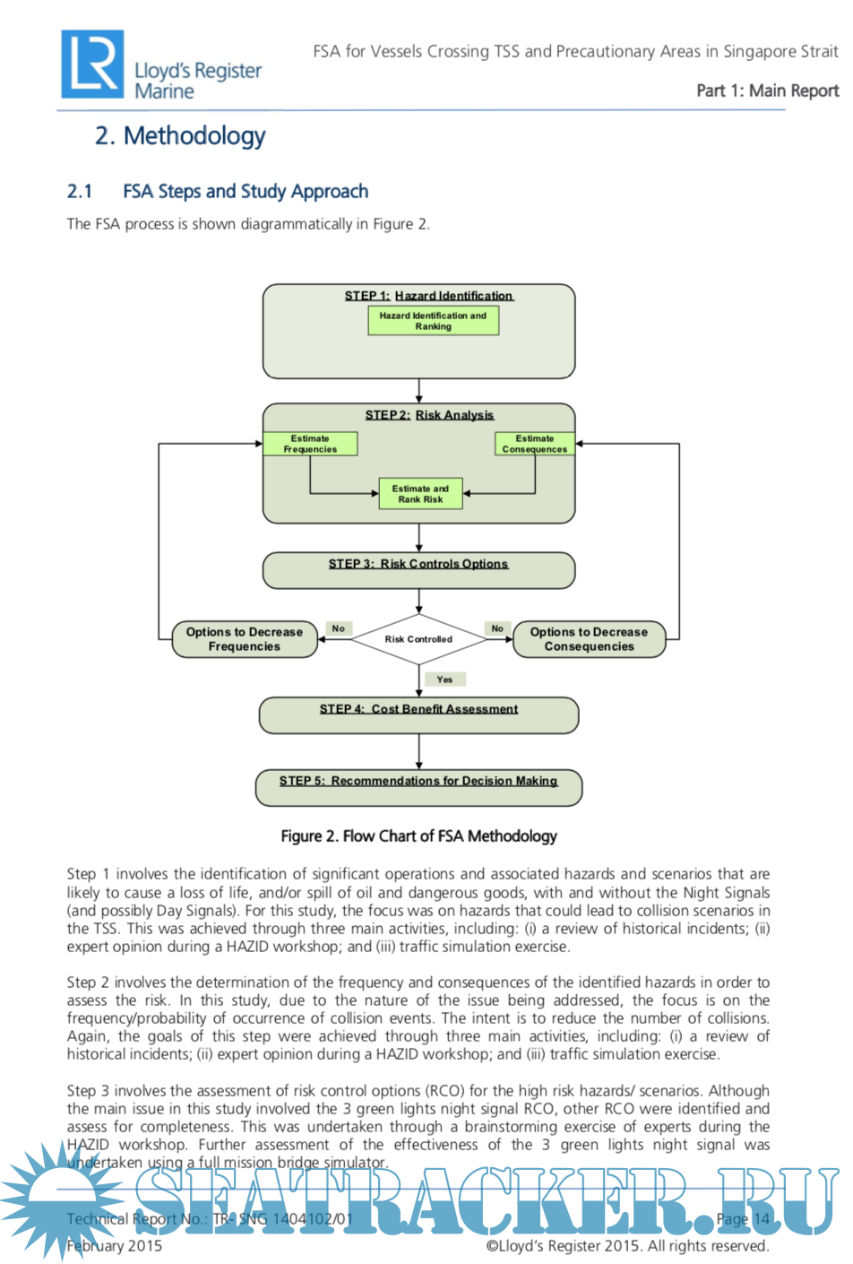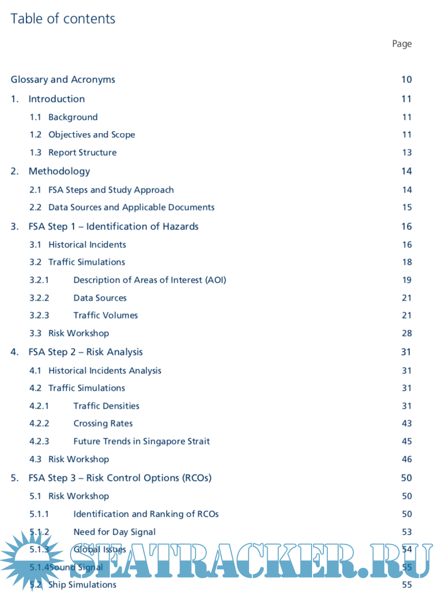 Description: This study was undertaken to perform a formal safety assessment (FSA) for the use of three green lights night signal for vessels crossing the traffic separation scheme (TSS) and precautionary areas in the Singapore Strait. In order to demonstrate the applicability of the study results to other areas worldwide with TSS, investigations of the traffic and navigational risks in two other selected areas with TSS, namely, the English Channel and San Francisco Bay were also undertaken. The study was carried out in accordance with IMO's FSA guidelines. FSA, a rational and systematic process for assessing the risks relating to maritime safety and the protection of the marine environment and for evaluating the costs and benefits of IMO’s options for reducing these risks, involves the following five stages: (1) Identification of hazards; (2) Risk analysis; (3) Risk control options; (4) Cost-benefit assessment; and (5) Recommendation for decision-making. These FSA steps were addressed through a number of studies and activities, including a review of historical incidents/ data, expert opinion during a HAZID workshop, traffic and ship simulation exercises, and cost-benefit analysis.