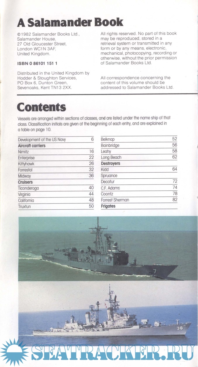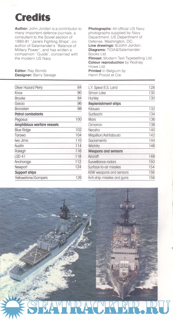 Description: 159 pages, smallish hardcover with color photo-illustrated endpapers, a color photo-illustrated frontispiece/title page and a lot of interior pictures/illustrations/couple tables (majority in color). "160 fact-packed pages. Full data on more than 40 warship types. Over 120 photographs, most in color, and finely detailed line drawings. Includes section on aircraft, weapons and sensors, and fleet organization details. A magnificently illustrated, compact directory of all the major ship classes serving in today's US Navy surface fleet.