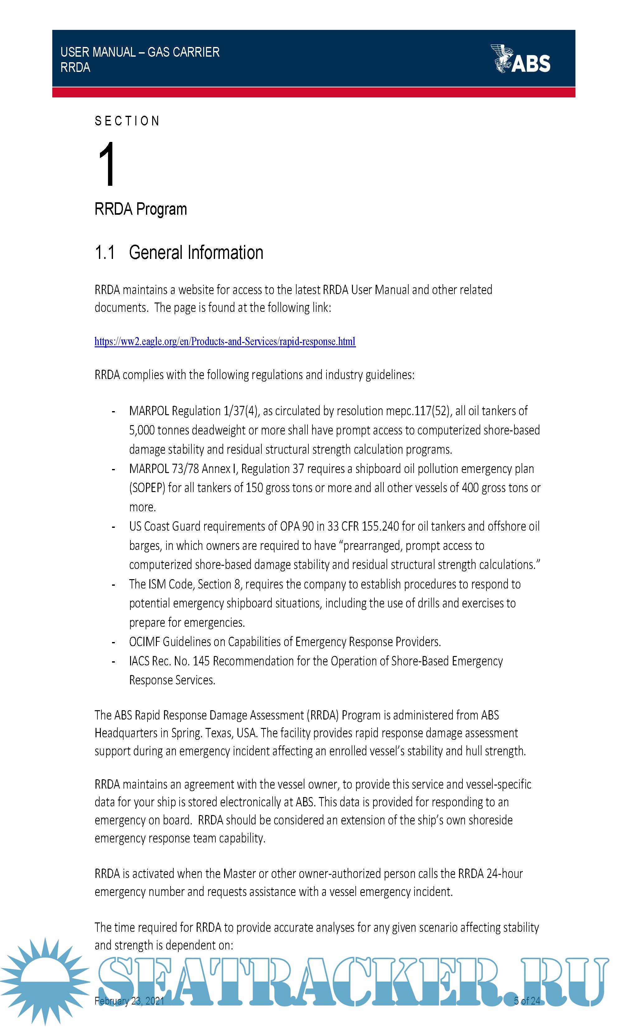 Year: 2021 Language: english Author: ABS Genre: Manual Publisher: ABS Format: PDF Quality: eBook Pages count: 25 Description: The Rapid Response Damage Assessment program (RRDA) is an organized team of engineers, naval architects, master mariners and support staff that respond 24/7 to ship related emergencies such as grounding and collision. Enrollment of a vessel in RRDA ensures direct access to technical support that is needed during vessel casualties. When activated, RRDA is an extension of the vessel management team’s own response capability, focusing on the measure of changes occurring to hull strength, stability and the extent to which risk of pollution can be mitigated. RRDA complies with the following regulations and industry guidelines: ✔ MARPOL Regulation 1/37(4), as circulated by resolution mepc.117(52), all oil tankers of 5,000 tonnes deadweight or more shall have prompt access to computerized shore-based damage stability and residual structural strength calculation programs. ✔ MARPOL 73/78 Annex I, Regulation 37 requires a shipboard oil pollution emergency plan (SOPEP) for all tankers of 150 gross tons or more and all other vessels of 400 gross tons or more. ✔ US Coast Guard requirements of OPA 90 in 33 CFR 155.240 for oil tankers and offshore oil barges, in which owners are required to have “prearranged, prompt access to computerized shore-based damage stability and residual structural strength calculations.” ✔ The ISM Code, Section 8, requires the company to establish procedures to respond to potential emergency shipboard situations, including the use of drills and exercises to prepare for emergencies. ✔ OCIMF Guidelines on Capabilities of Emergency Response Providers. ✔ IACS Rec. No. 145 Recommendation for the Operation of Shore-Based Emergency Response Services. .