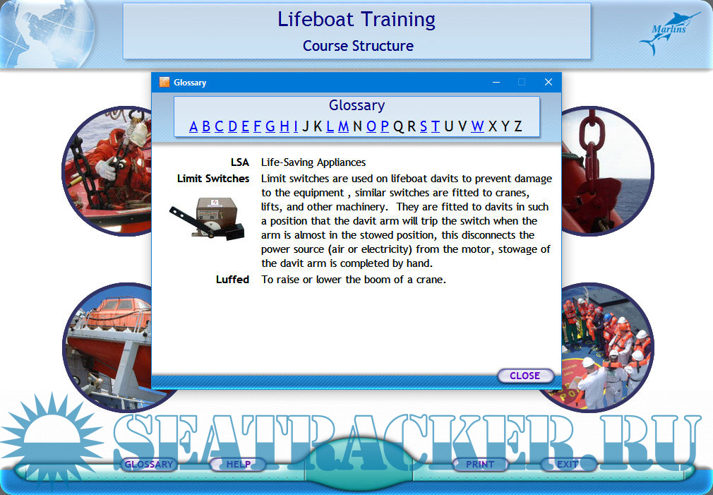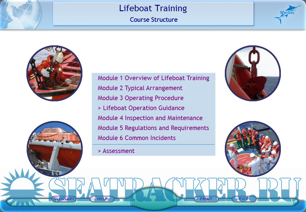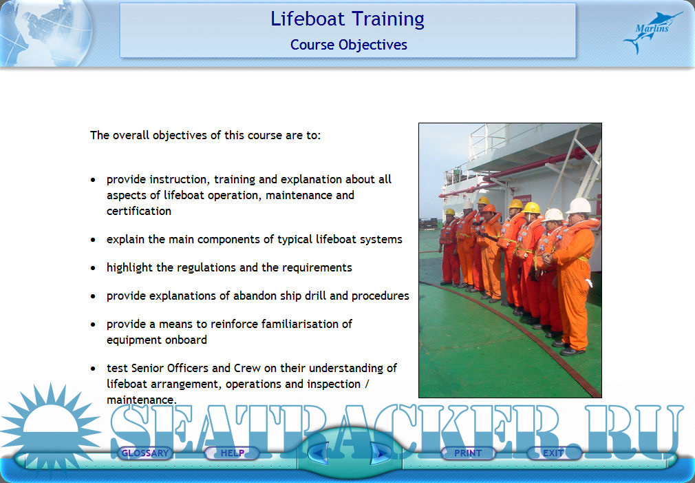 Description: The overall declared objectives of this computer-based training course developed by Marlins are to provide necessary instruction, training and explanation about all aspects of lifeboat operation, maintenance and certification, to describe the construction and working principles of the major components of the typical lifeboat systems, to highlight the regulations and the requirements, to provide explanations of abandon ship drill and procedures, provide a means to reinforce familiarization of equipment on board the ship, to test senior officers and crew on their understanding of lifeboat arrangement, operations and inspection/maintenance. The course for Support level covers overview of lifeboat training, typical arrangement, operating procedure, lifeboat inspection and maintenance, relevant regulations and requirements, and common incidents. After study of the first section of this training course, you shall be able to understand the whole importance of having lifeboat training, identify where lifeboat training can be carried out, specify the intervals for having lifeboat training, list the knowledge and skills you can obtain from lifeboat training, and describe how this computer-based training can enhance lifeboat training. The exercisel are presented in the form of a questionnaire.