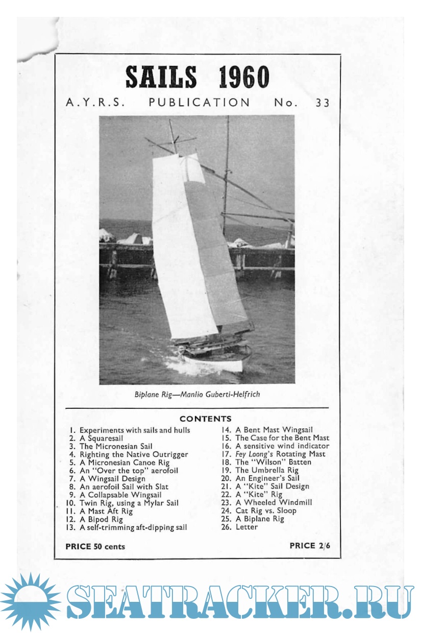 Year: 1960 Language: english Author: A.Y.R.S. Genre: Collection of books Publisher: A.Y.R.S. Format: PDF Quality: Scanned pages Pages count: 56 Description: The AYRS is a UK registered Educational Charity (No 234081) dedicated to finding out how to make yachting better (faster, more fun, whatever you want it to be). Our members run from sober sided professional yacht designers and builders to bearded eccentrics full of ideas that they cannot make work.From our members have come the modern sailing multihulls, self-steering gear, sailboards, a flock of successful sailing hydrofoils, the World Speed Sailing Record system, etc. Now people are taking off with kiteboats and autogyro-sails, and the first amphibious bicycle.