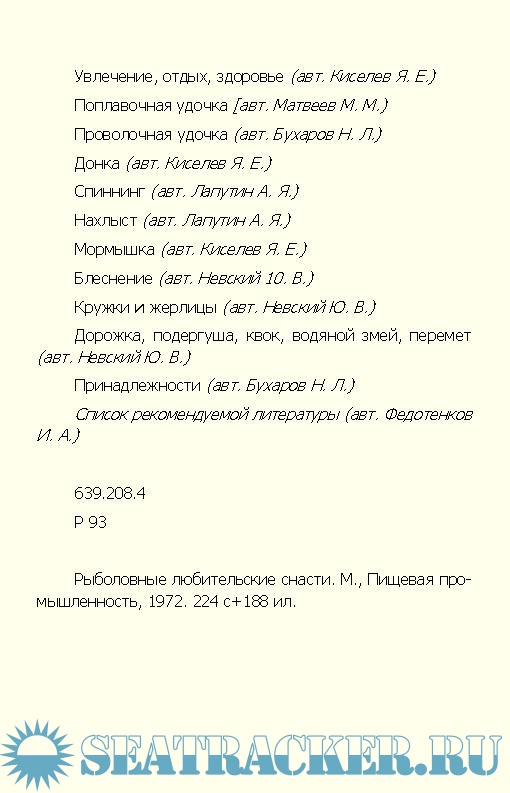 Год выпуска: 1972 Язык: русский Автор: Бухаров Н.Л. и др. Жанр: Практическое пособие Издательство: Пищевая промышленность Формат: FB2 Качество: Изначально компьютерное (eBook) Количество страниц: 452 Описание: В книге описаны рыболовно-спортивные снасти, применяемые рыболовами-любителями. Дана характеристика и устройство поплавочных и проводочных удочек, донок, спиннингов и др., выпускаемых не только промышленностью, но и самодельных. Рассказано о видах ловли с практическими советами и рекомендациями, в том числе описаны различные виды принадлежностей.