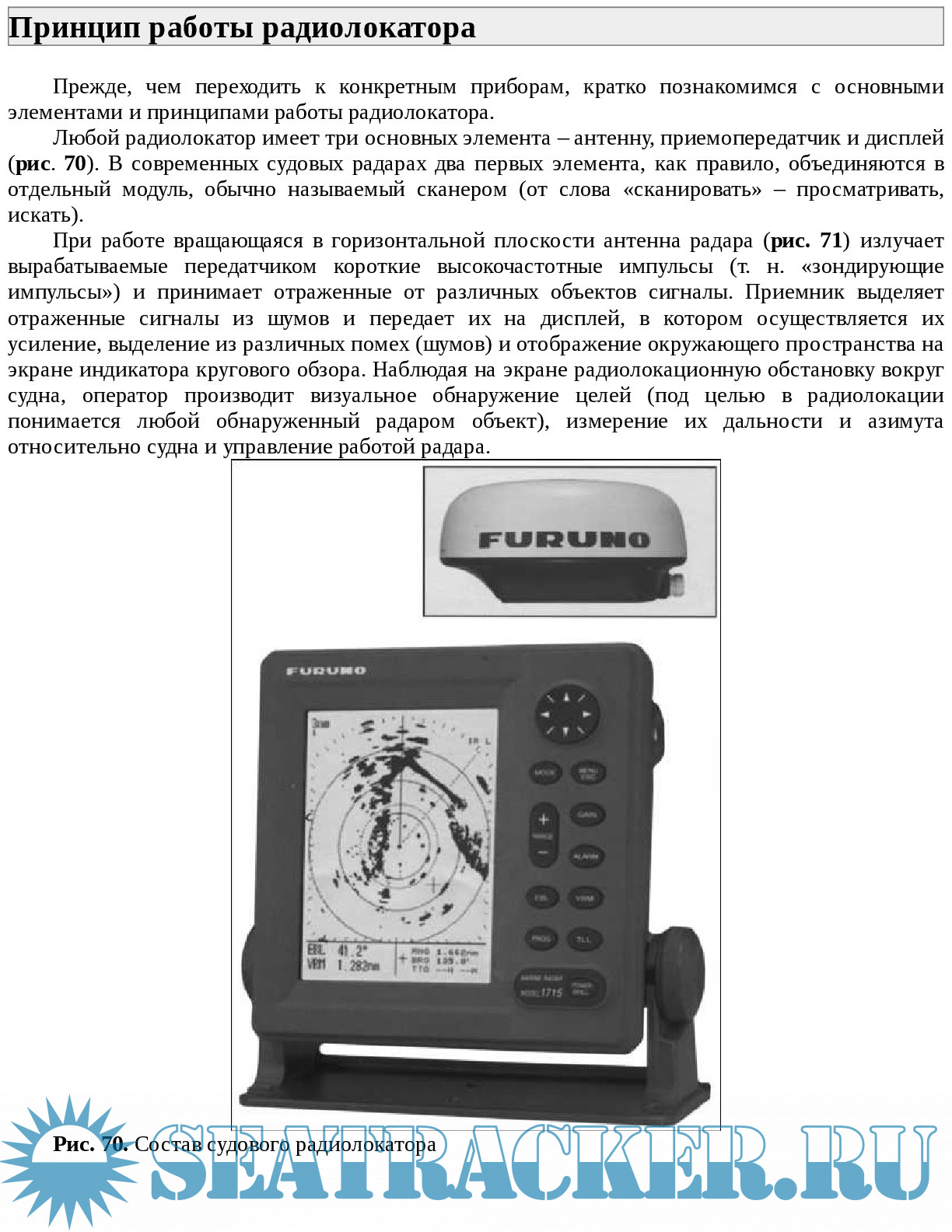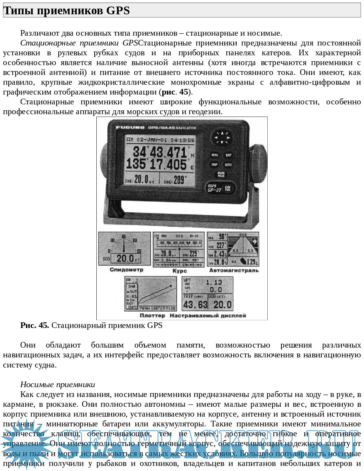 РЫБОПОИСКОВЫЕ ЭХОЛОТЫ Принцип работы эхолотов Устройство и характеристики эхолотов Установка эхолота Эксплуатация эхолота Изображение на экране Что дает эхолот рыбаку Эхолоты для зимней рыбалки ЭХОЛОТЫ ПЕРЕДНЕГО ОБЗОРА Общие сведения Особенности работы эхолотов СРЕДСТВА СПУТНИКОВОЙ НАВИГАЦИИ Принцип работы системы спутниковой навигации Типы приемников GPS Отображение навигационной информации Характеристики приемников GPS Работа с приемниками GPS ЭЛЕКТРОННАЯ КАРТОГРАФИЯ И ЭЛЕКТРОННО-КАРТОГРАФИЧЕСКИЕ СИСТЕМЫ Носители картографической информации Картплоттеры Сервисные функции СРЕДСТВА ОБЕСПЕЧЕНИЯ БЕЗОПАСНОСТИ ПЛАВАНИЯ Особенности связи на внутренних водных путях Правила ведения радиосвязи Средства радиосвязи ПРИЛОЖЕНИЕ Береговые радиостанции, ведущие наблюдение за сигналами бедствия Расписание береговых радиостанций, передающих прогнозы погоды, предупреждения и путевую информацию Связь на море СУДОВЫЕ РАДИОЛОКАТОРЫ ДЛЯ МАЛОМЕРНОГО ФЛОТА Принцип работы радиолокатора Основные характеристики радаров Интегральные навигационные системы