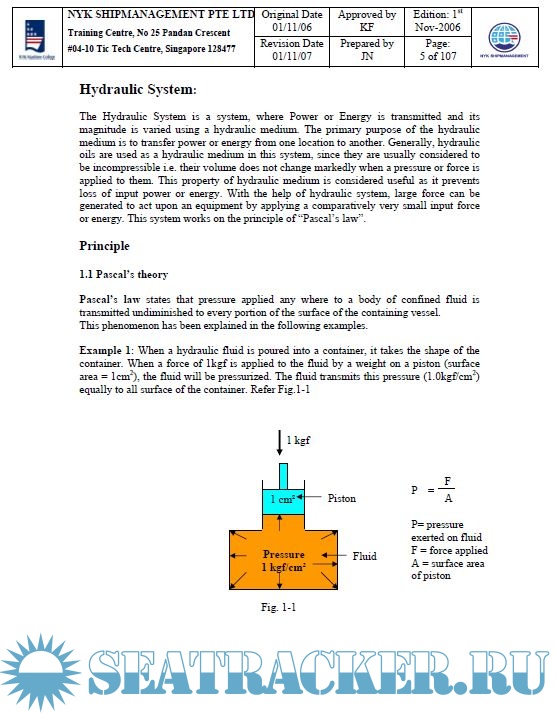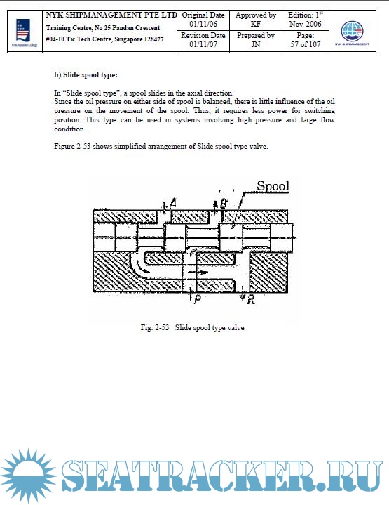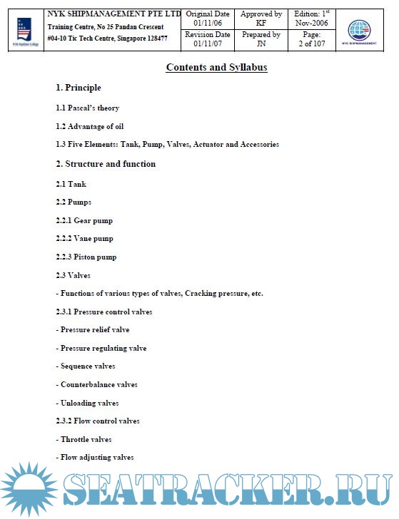 Year: 2007 Language: english Author: NYK Maritime College Genre: Training courses Publisher: NYK Maritime College, Singapore Edition: 1st Format: PPT Quality: eBook Pages count: Multiple Description: Course Code: NMC 24 Course Name: Hydraulic Training Duration: 1 Day Objectives of the Training: After completion of the training, the trainees should understand the followings: 1) The principle of oil hydraulic system 2) The structure and the function of equipments 3) Adjusting of valve operation speed 4) Maintenance work 5) Emergency operation.
