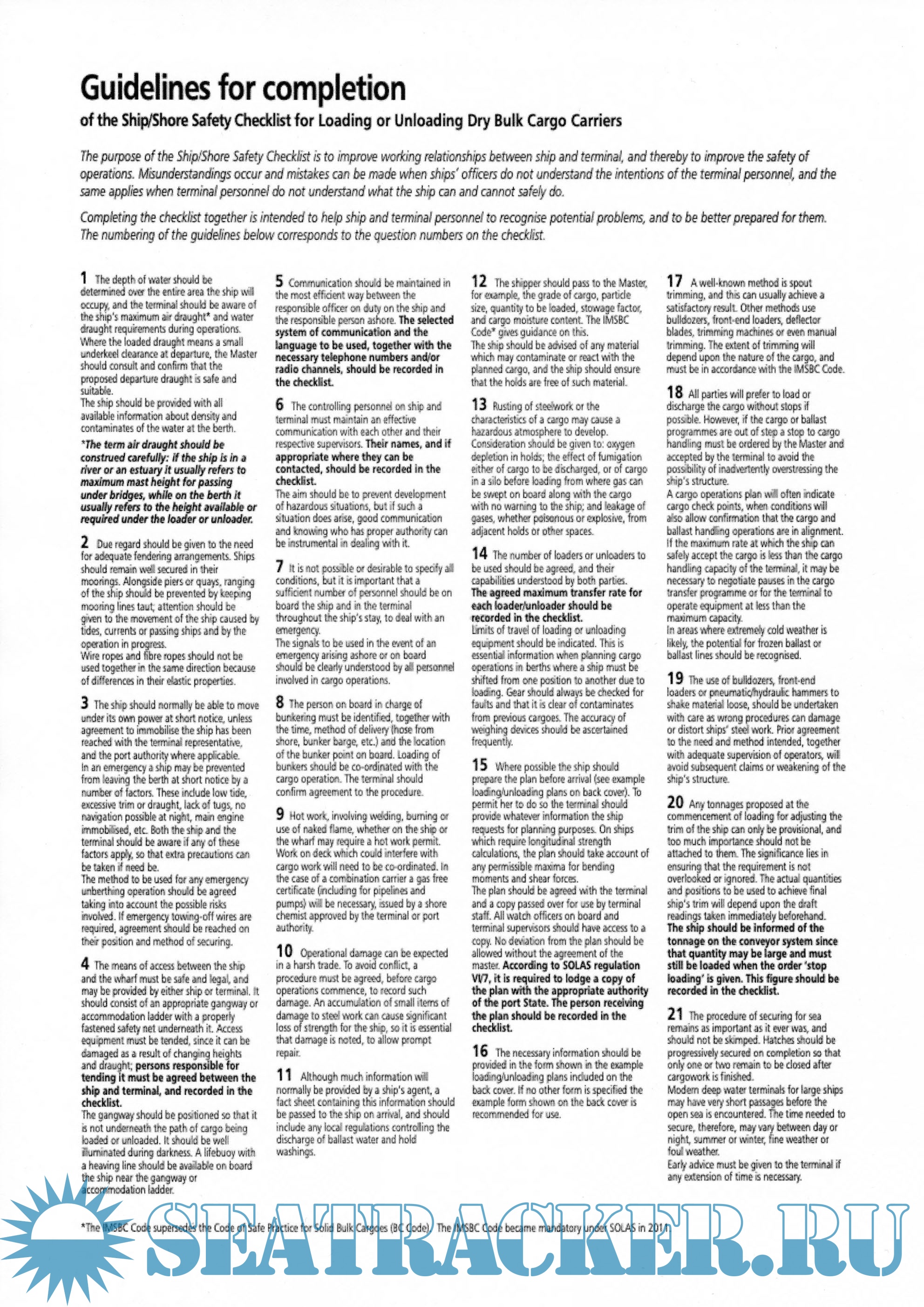 Ship/Shore Safety Checklist for Loading or Unloading Dry Bulk Cargo Carriers