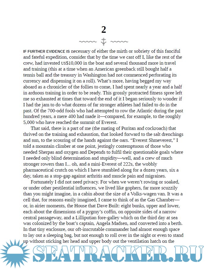 Year: 2013 Language: english Author: Charles Wilkins Publisher: Greystone Books ISBN: 978-1-55365-878-8 Format: PDF Quality: eBook Pages count: 221 Description: The dramatic and hilarious story of risk and survival, as well as the importance of our connections to the planet, on a human-powered journey across the ocean. It was to be an expedition like no other—a run across the Atlantic from Morocco to Barbados aboard an experimental rowboat. There would be no support vessel, no stored water, no sails or motor. The boat's crew of sixteen included several veterans of U.S. college rowing, a number of triathletes, a woman who had rowed both the Atlantic and Indian Oceans, and a scrawny sexagenarian looking for a last great challenge—our chronicler, Charles Wilkins. When he joined the expedition, Wilkins had never swung an oar in earnest. Accompanied by a devoted crew of misadventurers, Wilkins takes the reader along for seven weeks of rationed food, extreme sleep deprivation, and life-threatening seas—as well as sharks, whales, and an ever-disintegrating boat. Little Ship of Fools is a rich and fascinating story of courage, community, the importance of risk in our lives, and the resilience and depth of the human spirit.