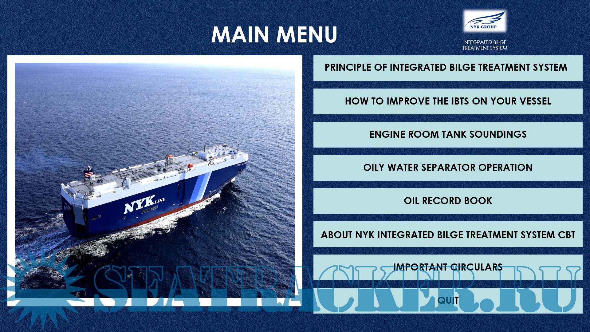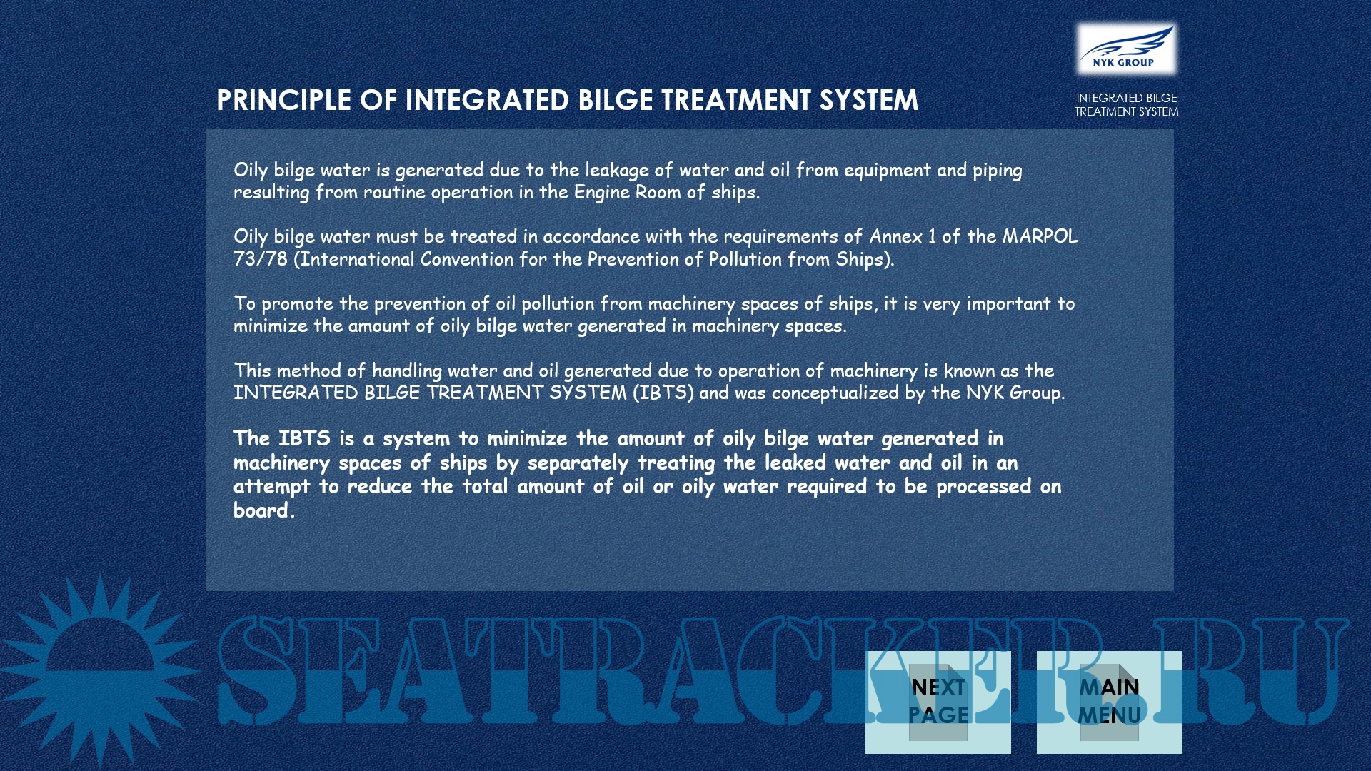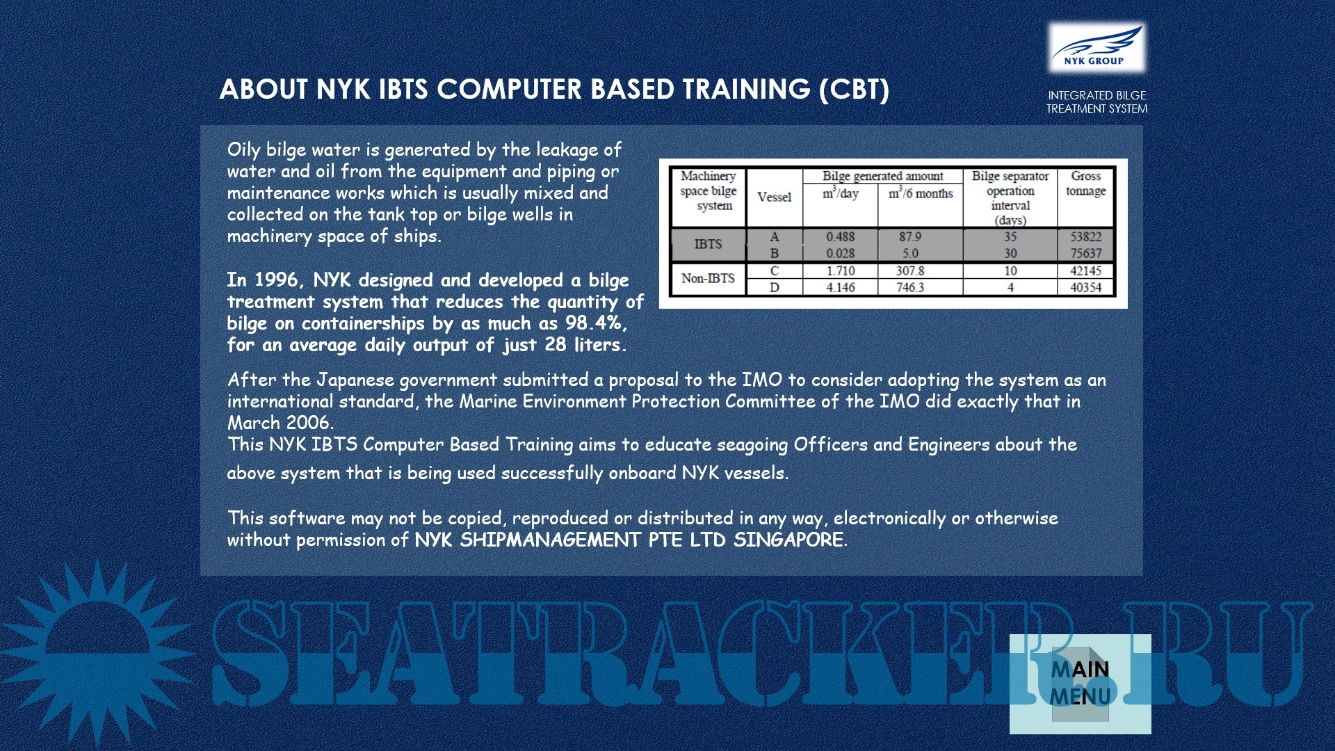 Description: This NYK Integrated Bilge Treatment System (IBTS) Computer Based Training aims to educate Officers and Engineers about the IBTS system that is being used.