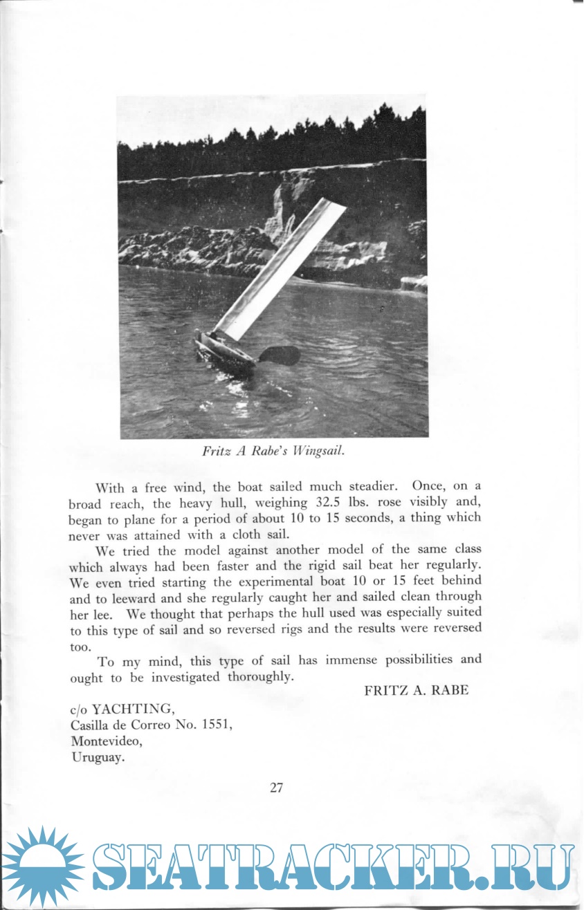 Year: 1956 Language: english Author: A.Y.R.S. Genre: Collection of books Publisher: A.Y.R.S. Format: PDF Quality: Scanned pages Pages count: 28 Description: The AYRS is a UK registered Educational Charity (No 234081) dedicated to finding out how to make yachting better (faster, more fun, whatever you want it to be). Our members run from sober sided professional yacht designers and builders to bearded eccentrics full of ideas that they cannot make work.From our members have come the modern sailing multihulls, self-steering gear, sailboards, a flock of successful sailing hydrofoils, the World Speed Sailing Record system, etc. Now people are taking off with kiteboats and autogyro-sails, and the first amphibious bicycle.