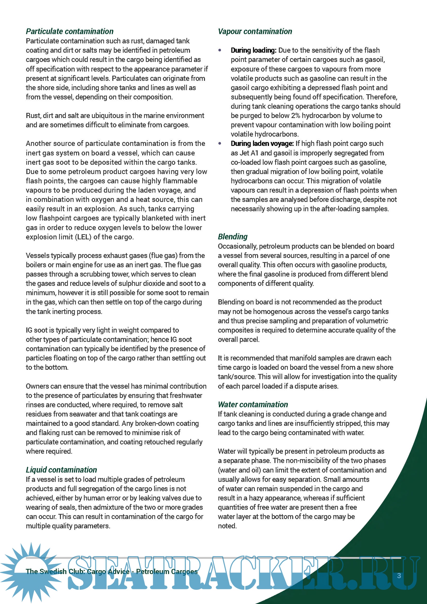 Year: 2021 Language: english Author: The Swedish Club Genre: Guide Format: PDF Quality: eBook Pages count: >0 Description: The Swedish Club recently launched a cargo advice Guide, focusing on petroleum cargoes shipments. As the club explains, a common contamination found in refined petroleum products is the presence of particulates. This often leads to a failure in the appearance parameter which states that the cargo should be ‘clear and bright’ and typically leads to further cargo processing operations. A variety of refined petroleum cargoes are transported via the shipping industry. These cargoes are classified by the hydrocarbon range of the products.