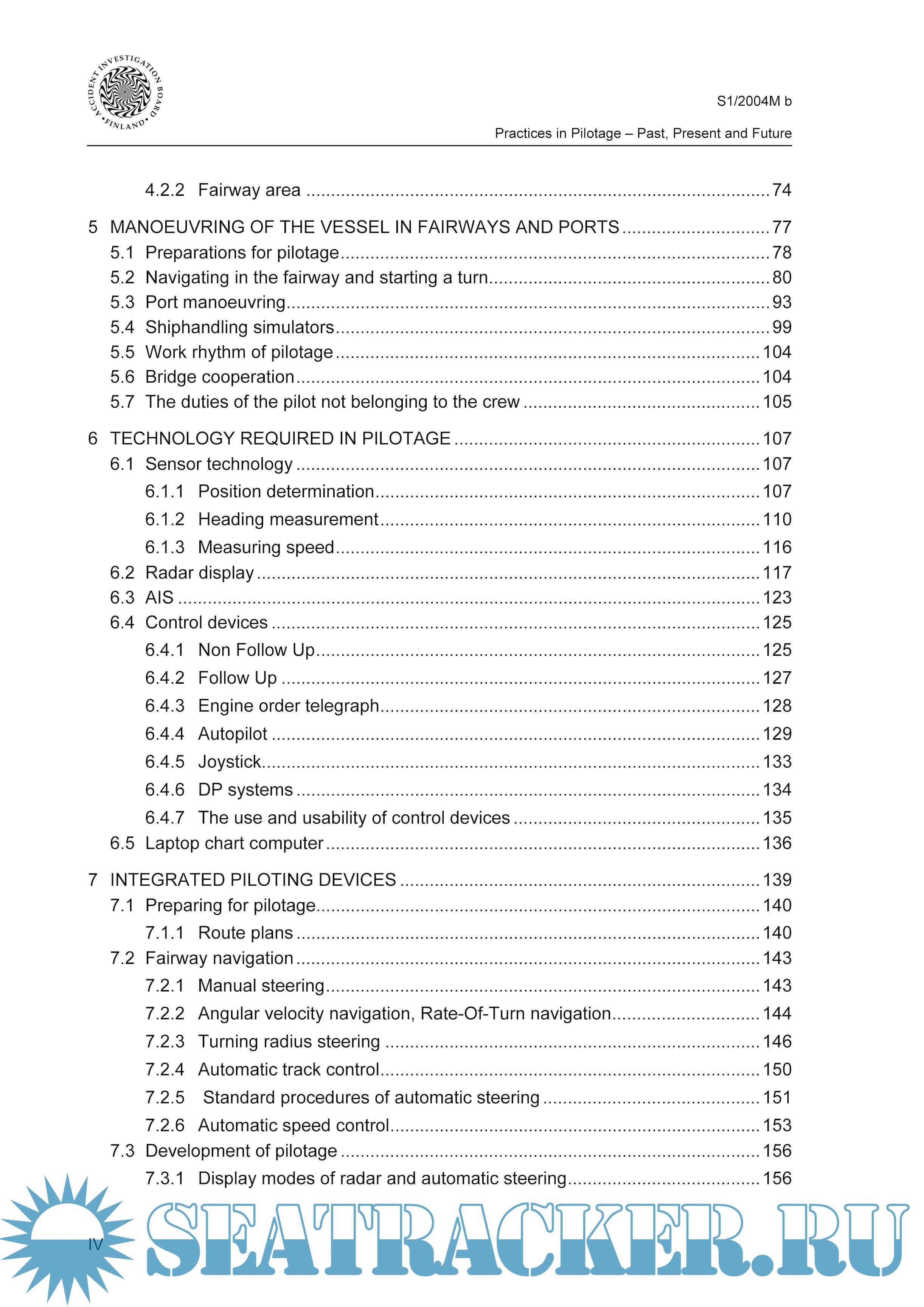 Chapter 4 describes the most important phenomena related to the manoeuvrability of the vessel and to the interaction of the vessel and its environment. Chapter 5 describes the preparations made prior to pilotage and piloting both as a technical activity and as a part of the bridge organization. Chapter 6 goes through the technology needed in piloting, the technical minimum requirements and the ergonomic use of the appliances. Chapter 7 deals with integrated piloting devices and the possibilities the technical systems offer to support pilotage.