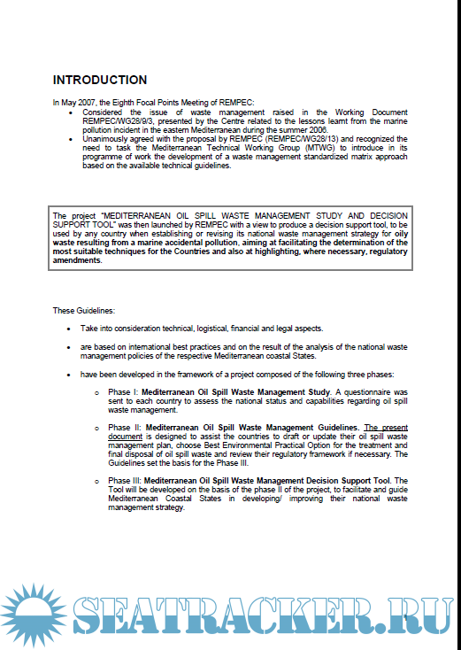Year: 2011 Language: english Author: REMPEC Genre: Guide Format: PDF Quality: eBook Pages count: 144 Description: Due to the difficulties associated with the management of the waste, after a spill, from its removal, transport, treatment, to the final disposal, waste management is considered as being a key element of the contingency plan. It is thus a fundamental requirement that waste management is incorporated in the response strategy from the beginning of the response operation to ensure a successful response, avoid secondary contamination and minimize costs.