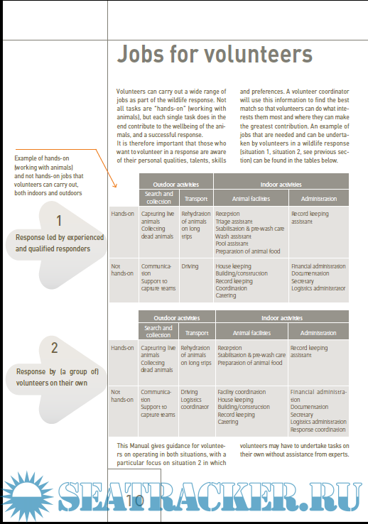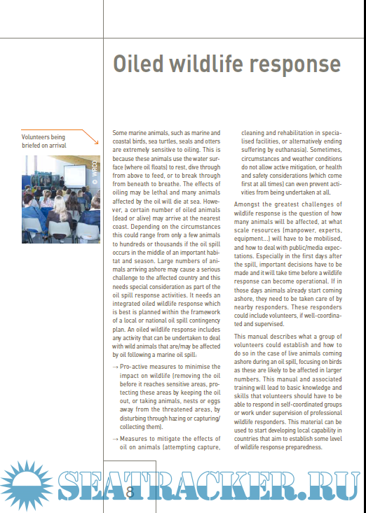 Year: 2013 Language: english Author: POSOW Genre: Manual Format: PDF Quality: eBook Pages count: 60 Description: Some marine animals, such as marine and coastal birds, sea turtles, seals and otters are extremely sensitive to oiling. This is because these animals use the water surface (where oil floats) to rest, dive through from above to feed, or to break through from beneath to breathe. The effects of oiling may be lethal and many animals affected by the oil will die at sea. However, a certain number of oiled animals (dead or alive) may arrive at the nearest coast. Depending on the circumstances this could range from only a few animals to hundreds or thousands if the oil spill occurs in the middle of an important habitat and season. Large numbers of animals arriving ashore may cause a serious challenge to the affected country and this needs special consideration as part of the oil spill response activities.