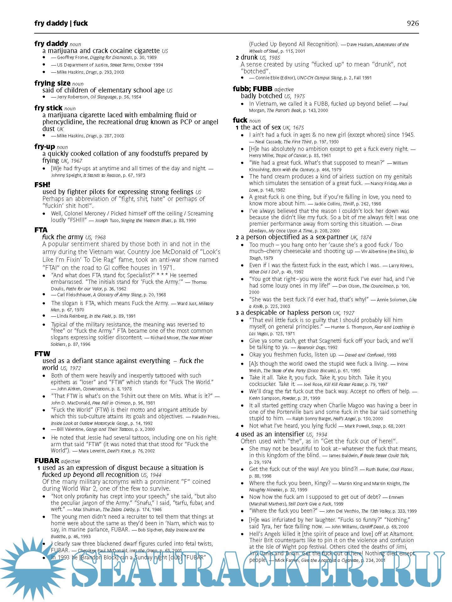 • unprecedented coverage of World English, with equal prominence given to American and British English slang, and entries included from Australia, New Zealand, Canada, India, South Africa, Ireland, and the Caribbean