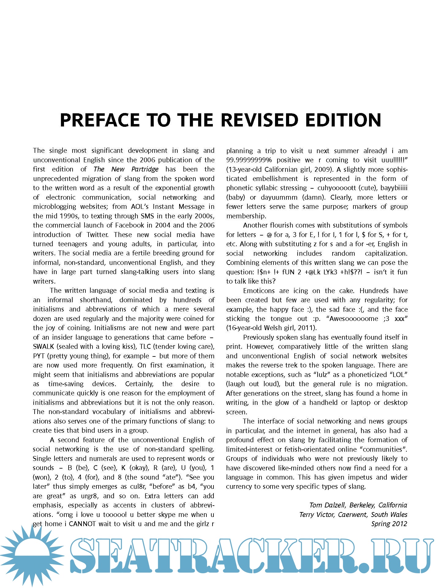 Year: 2013.(2020) Language: english Author: Tom Dalzell And Terry Victor Genre: Dictionary Publisher: Routledge Edition: 2nd edition Format: PDF Quality: eBook Pages count: 2527 Description: The heir and successor to Eric Partridge's brilliant magnum opus, The Dictionary of Slang and Unconventional English, this two-volume New Partridge Dictionary of Slang and Unconventional English is the definitive record of post WWII slang. Containing over 60,000 entries, this new edition of the authoritative work on slang details the slang and unconventional English of the English-speaking world since 1945, and through the first decade of the new millennium, with the same thorough, intense, and lively scholarship that characterized Partridge's own work. Unique, exciting and, at times, hilariously shocking, key features include: • unprecedented coverage of World English, with equal prominence given to American and British English slang, and entries included from Australia, New Zealand, Canada, India, South Africa, Ireland, and the Caribbean • emphasis on post-World War II slang and unconventional English • published sources given for each entry, often including an early or significant example of the term’s use in print. • hundreds of thousands of citations from popular literature, newspapers, magazines, movies, and songs illustrating usage of the headwords • dating information for each headword • in the tradition of Partridge, commentary on the term’s origins and meaning New to this edition: • A new preface noting slang trends of the last five years • Over 1,000 new entries from the US, UK and Australia • New terms from the language of social networking • Many entries now revised to include new dating, new citations from written sources and new glosses The New Partridge Dictionary of Slang and Unconventional English is a spectacular resource infused with humour and learning – it’s rude, it’s delightful, and it’s a prize for anyone with a love of language. :