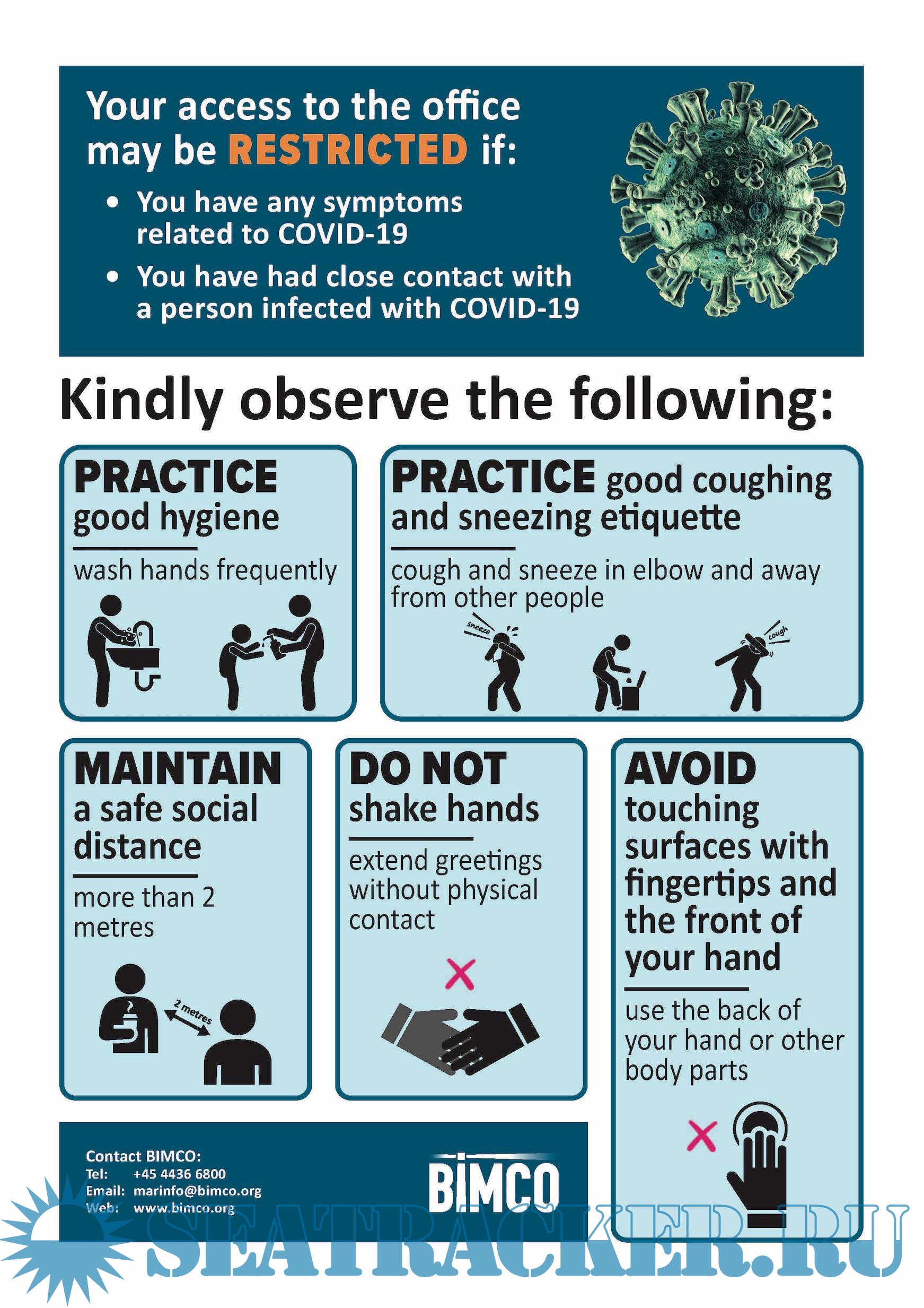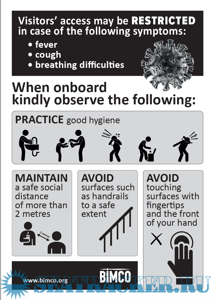 Description: BIMCO-made posters to protect seafarers and visitors onboard ships against Coronavirus (COVID-19). Black-and-white and coloured posters that can be easily printed and used onboard ships at shoreside, shipside of gangways as well at various locations in the accommodation.
