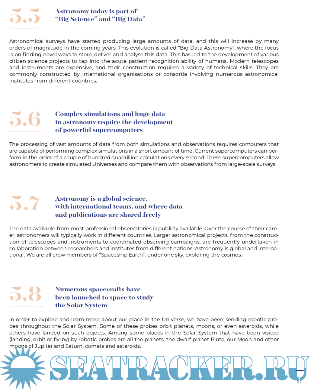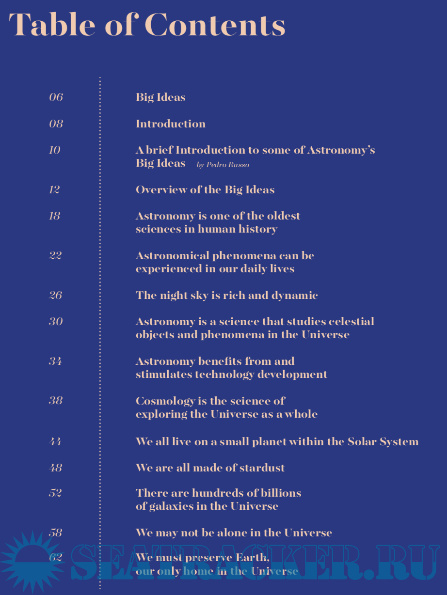 Big Ideas in Astronomy builds on the pioneering American Association for the Advancement of Science (AAAS) Project 2061. The AAAS Project 2061 started in 1986, the year Halley’s Comet passed near Earth. The AAAS was intrigued by what affects children’s connection to the natural world — who were starting school then will see the return of the Comet. What scientific and technological changes will they also see in their lifetime? How can education prepare them to make sense of how the world works; to think critically and independently; and to lead intere- sting, responsible, and productive lives in a culture increasingly shaped by science and technology? Big Ideas in Astronomy also expands on the work developed by other scientific disciplines and projects, namely: Cli- mate Science Literacy, Earth Science Literacy Principles, Ocean Literacy and Big Ideas of Science.