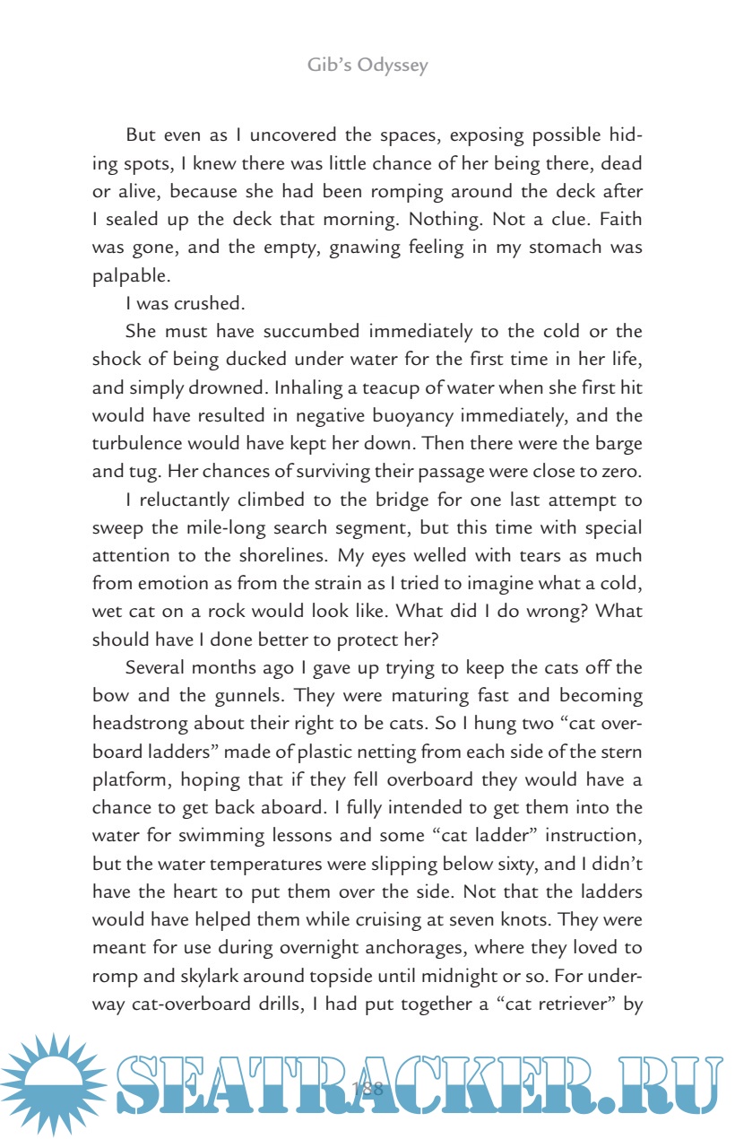 On an astonishing six-month voyage, Gib and his boat, Ka-Ching, encounter everything from an incompetent sailboat captain who lets his tow-rope wrap around Ka-Ching’s propellers and when he dives into the water to cut it loose accidently stabs himself with his knife, to the Navy and Coast Guard Zodiacs rushing to stop him from entering a naval bombardment zone. Gib carries out epic searches for his two kittens when they go AWOL at an Atlantic City marina and when one later falls overboard. All the while, he is forced to cope with increasing levels of paralysis, steering the boat home with his feet and unable to speak.
