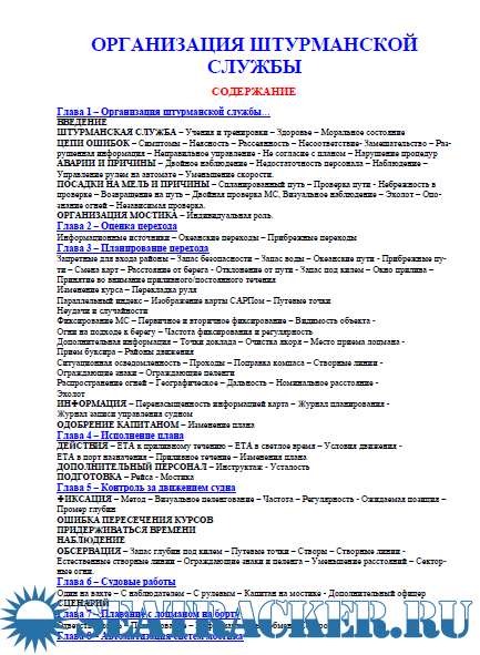 Язык: русский Жанр: Практическое руководство Формат: PDF Качество: Отсканированные страницы Количество страниц: 38 Описание: ель предусмотрительного мореплавателя должна обеспечить, чтобы их судно безопасно и эффективно достигло своего назначения. Чтобы делать это последовательно, нужен уровень мастерства, который не легко определить, но который необходим, чтобы стать частью морской культуры, примерно, для 80000 интернациональных торговых судов, каждый из которых участвует в этой общей цели. Подобно всем знаниям, основанным на мастерстве, наблюдении на мостике и судовождении требуется практика, поддержка и очередное подтверждение. Без этого они могут стать временными работниками. Действия сделанные на мостике, могут быть слепо приняты и информационный обмен мнениями, между Капитаном и вахтенным офицером, теряет силу в рабочих взаимоотношениях, где высокомерие подтверждается. Когда действия на мостике организованы свободно, впечатление может быть, что все будет хорошо. Однако, когда неожиданное случается, возникает путаница. Становиться более трудным принять решение и возможность существования ошибочного мнения остается, что может привести к случайности. Случайность по природе неожиданна, но чаще случайность происходит потому, что нет системы в действиях, чтобы обнаружить и в результате предотвратить одну персональную ошибку - ошибку типичную всему человечеству, когда кто-то что-то делает. Основное направление выпуска этой книги объяснить, как подготовить безопасное, хорошо спланированное плавание, которое управляется Капитаном, офицерами и командой в такой степени, когда судно все время ведется под определенным контролем, которое поддерживается и при лоцмане, когда он на борту. Можно спорить, что методы, предложенные в этой книге, помогать, являются также требованием к личному составу или что нет достаточно времени для планирования следующего рейса должным образом. Альтернативно, можно высказать, что задание на выполнение этого весьма важное, но нет возможностей. Эта дискуссия не может быть решена через мнения. Они широко различаются. Спорные вопросы могут быть решены оценкой требований для обеспечения безопасного плавания и исполнять на месте систему, чтобы удовлетворить этим требованиям.