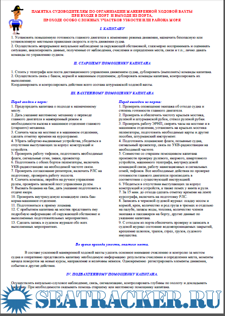 Описание: Памятка судоводителям по организации маневренной ходовой вахты при входе в порт и выходе из порта, проходе особо сложных участков узкости или района моря.