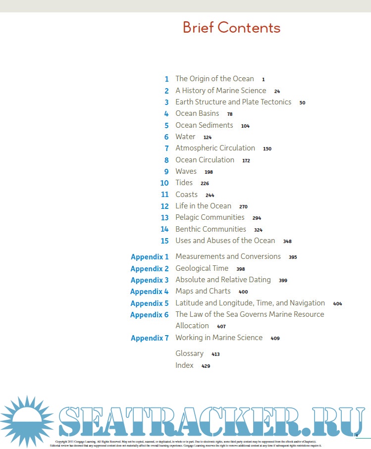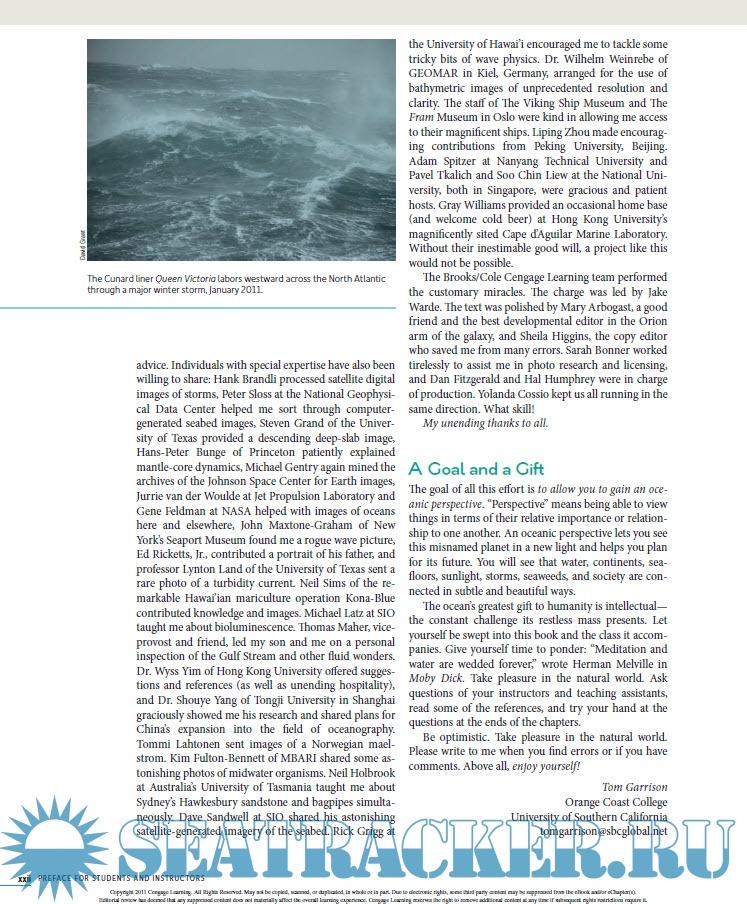 Year: 2012 Language: english Author: Tom S. Garrison Publisher: Cengage Learning, Inc ISBN: 978-0840061553 Format: PDF Quality: eBook Pages count: 466 Description: The sixth edition of Essentials Of Oceanography conveys Garrison's enthusiasm for oceanography to non-science students taking an introductory course. It is a streamlined version of his bestselling Oceanography text, but was created specifically to meet the needs of a shorter course. This text provides a basic understanding of the scientific questions, complexities, and uncertainties involved in ocean use, and the role and importance of oceans in nurturing and sustaining life on the planet.