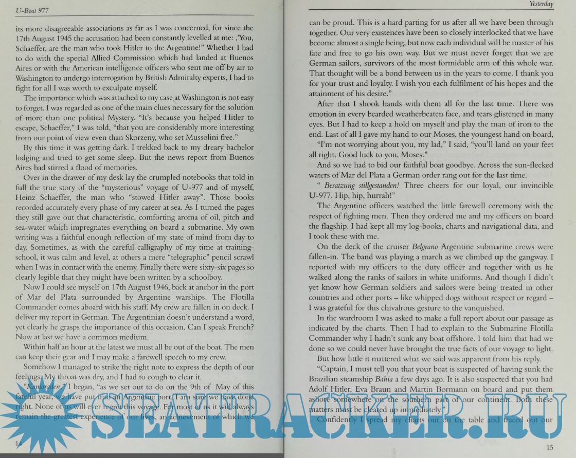 Description: When it was first published in 1953, opinions were sharply divided between those who deplored the apparent extolling of a vicious form of warfare, and this who found in Heinz Schaeffer s account a revealing picture of the German Navy s training and methods. U-Boat 977 was the German submarine that escaped to Argentina at the end of World War Two. This epic journey started from Bergen in Norway, where in April 1945 it was temporarily based, and took three and a half months to complete. Because of the continuing Allied naval activity the commander decided to make the first part of the journey underwater. Before surfacing near the west coast of Africa U-977 had spent a remarkable sixty-six days submerged. Heinz Schaeffer, the commander of U-977 wrote a full account of his career that culminated in this last command. It depicts the gruelling aspects of a submariner s life aboard a vessel that was subjected to harsh conditions of the sea and oceans. As an experienced commander Schaeffer took part in many of the decisive U-boat operations in the North Sea and Atlantic Ocean. In the final months of the war, and in common with most surviving U-boat commanders, Schaeffer and his crew came under constant attacks from Allied aircraft and surface ships. The final part of U-Boat 977 is Schaeffer s account of the journey to Argentina and lays to rest some of the more fanciful sorties that followed its arrival.