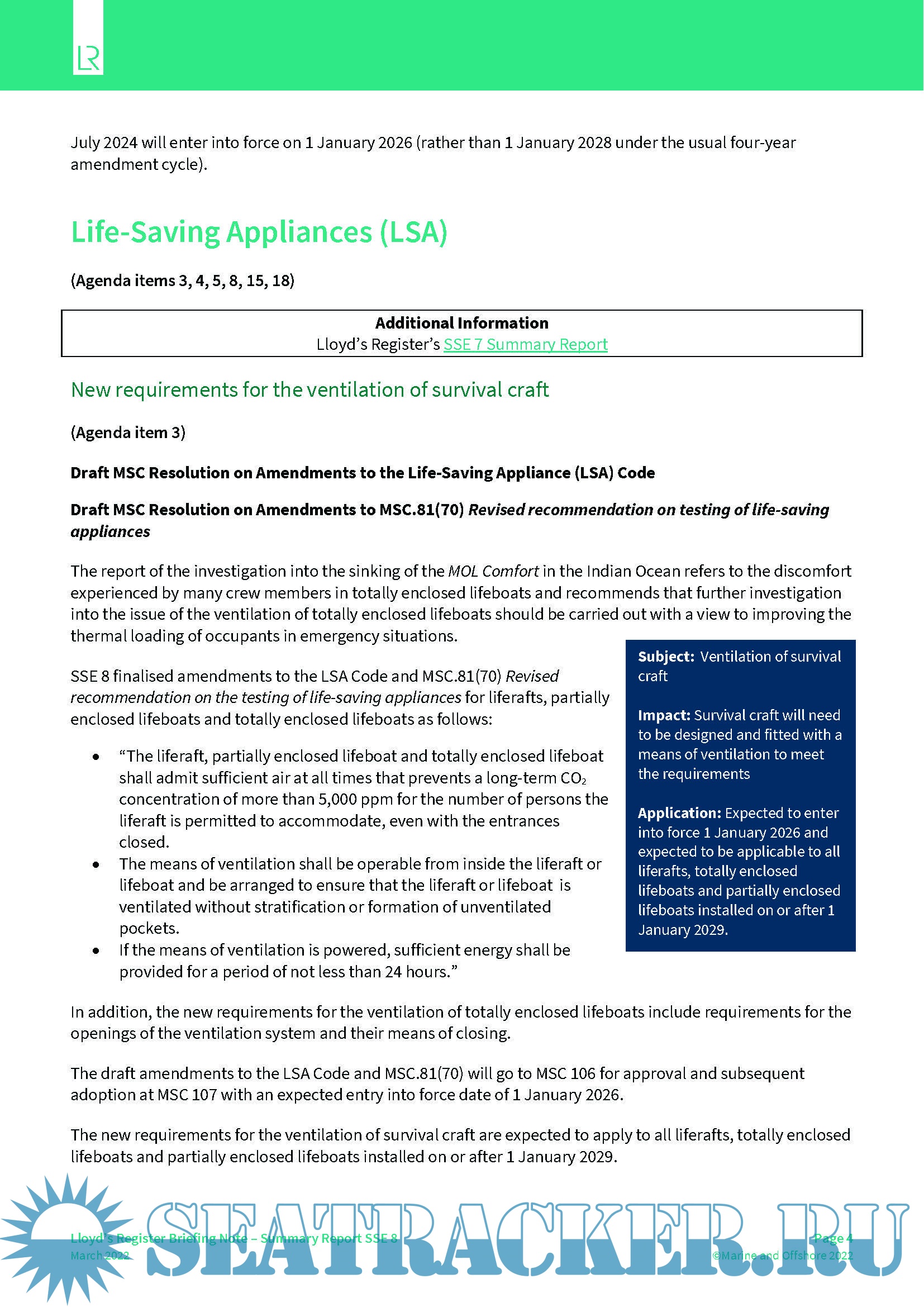 LR Summary Report for the IMO Ship Systems and Equipment Sub-Committee (SSE 9) - Lloyd's…