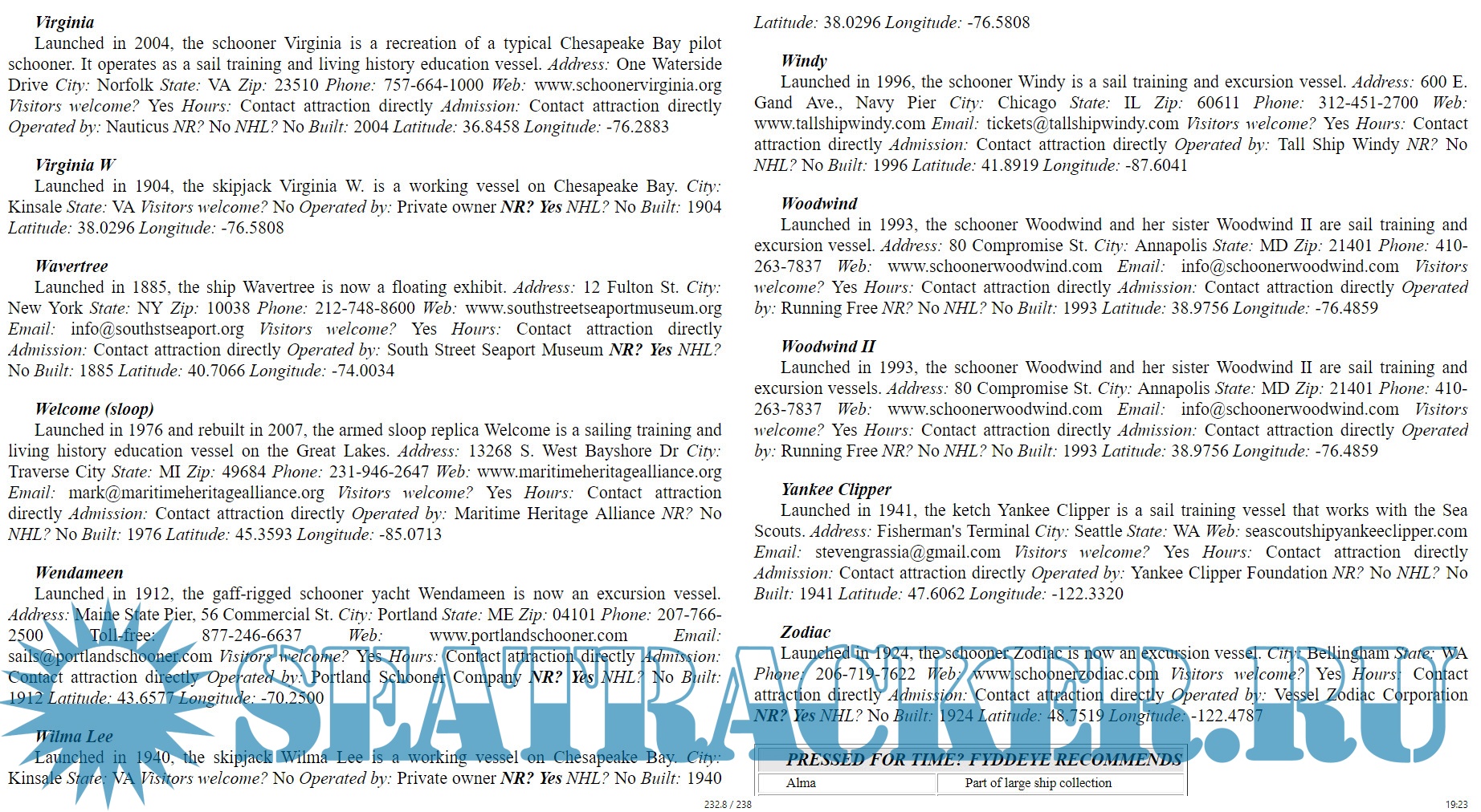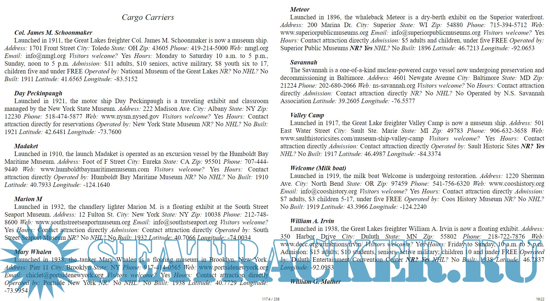 Each listing contains a short description of the vessel, its location, contact information, website, hours and ticket prices. Many vessels are free to board!