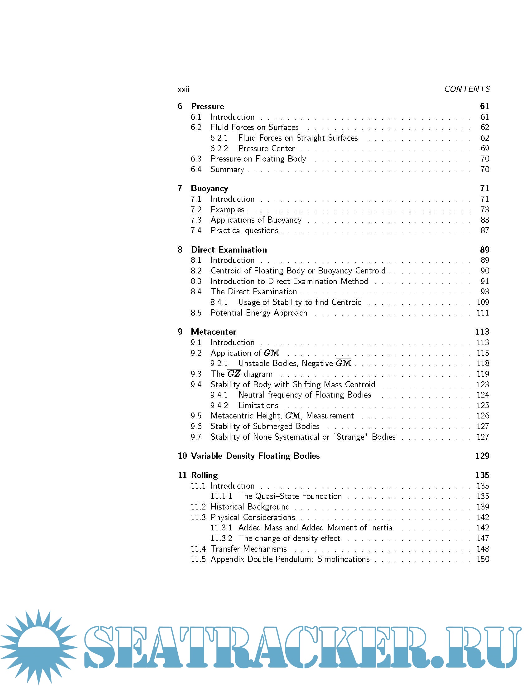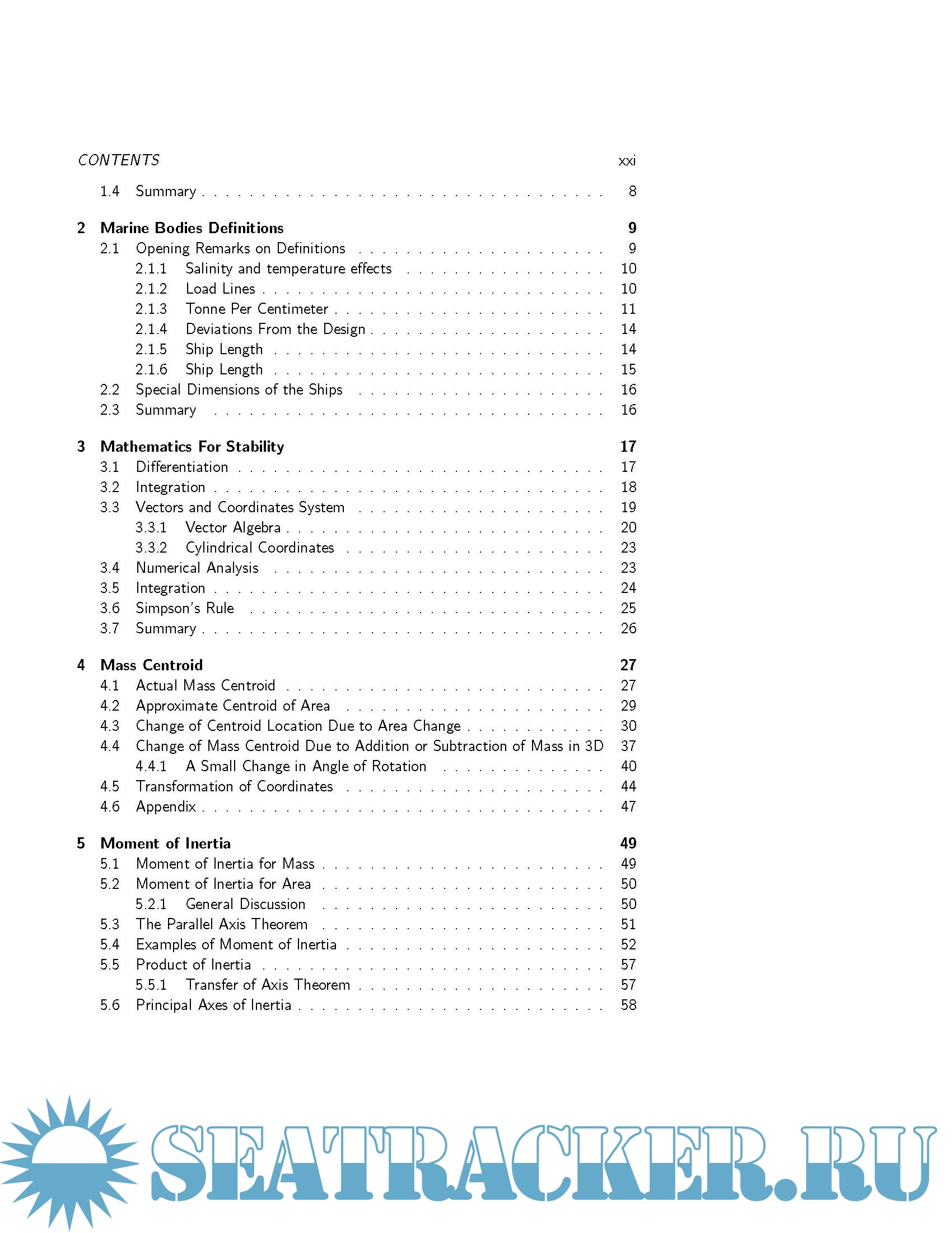Year: 2021 Language: english Author: Genick Bar-Meir Genre: Technical book Edition: Version 0.7.0 January 8, 2022 Format: PDF Quality: eBook Pages count: 249 Description: This book contains innovative ideas. In fact, the book creates a revolution in the understanding of ship stability. One of the chief problems in ship stability is the rolling (ship rotation) which was treated in the past as a simple pendulum with damping (or without) with external forces (waves, wind etc). This common mistake in this approach is rooted in the assumption that the location of the rotating point. Mistakenly, it was assumed that the rotation point is at the metacenter, an imaginary point which measures the ship's stability. In fact, all the books on stability, that were examined, believe in this mistake. This book also describes the physical transfer mechanism from one rotation mode (like roll) to another (like pitch). The reason that this developments are first depicted in this book is because of the new direct examination method. This innovative method also has a byproduct that shows a way to calculate the centroid of a circular segment. Nevertheless, the new technique to calculate the centroid is extremity far from being the main and only advantage.