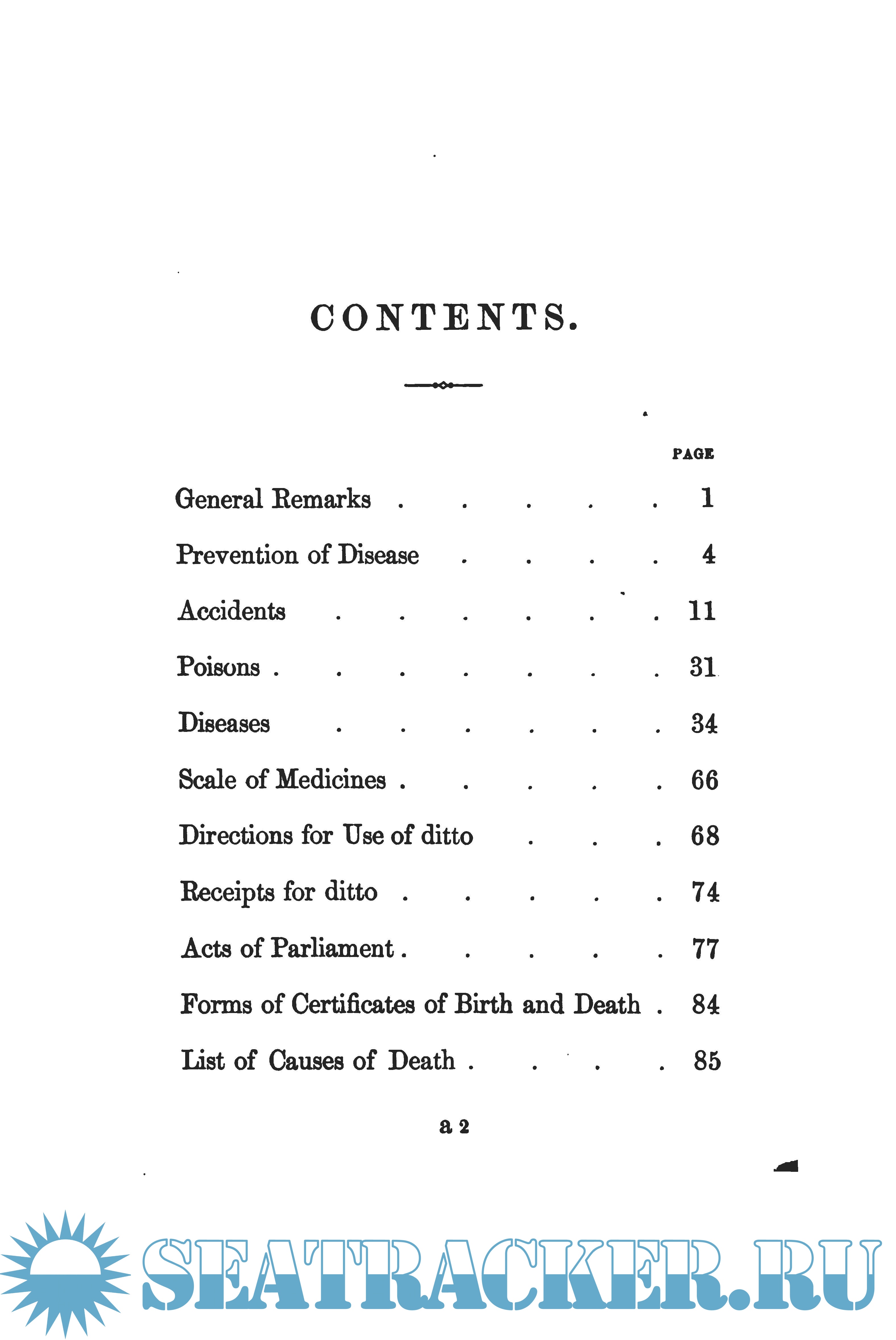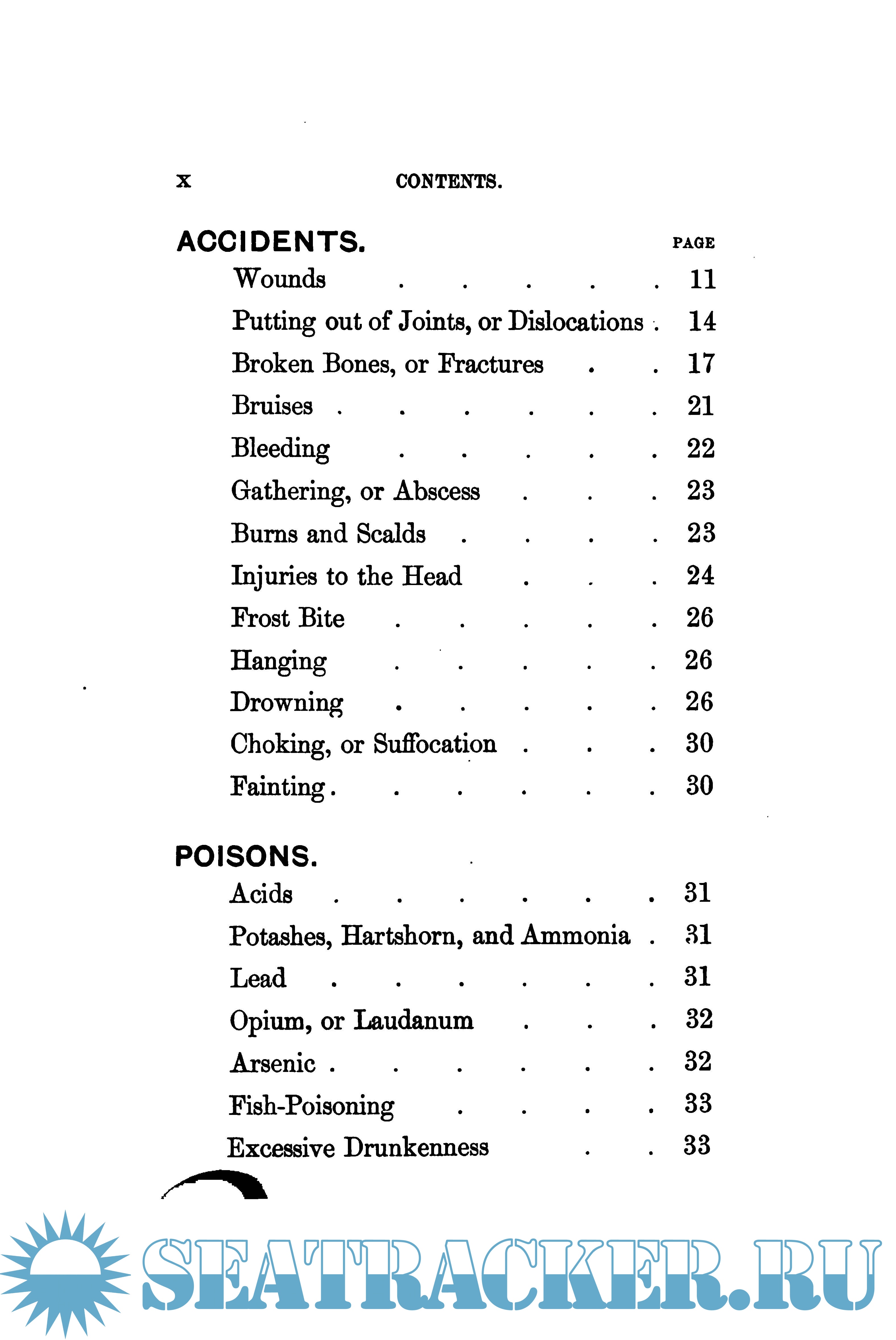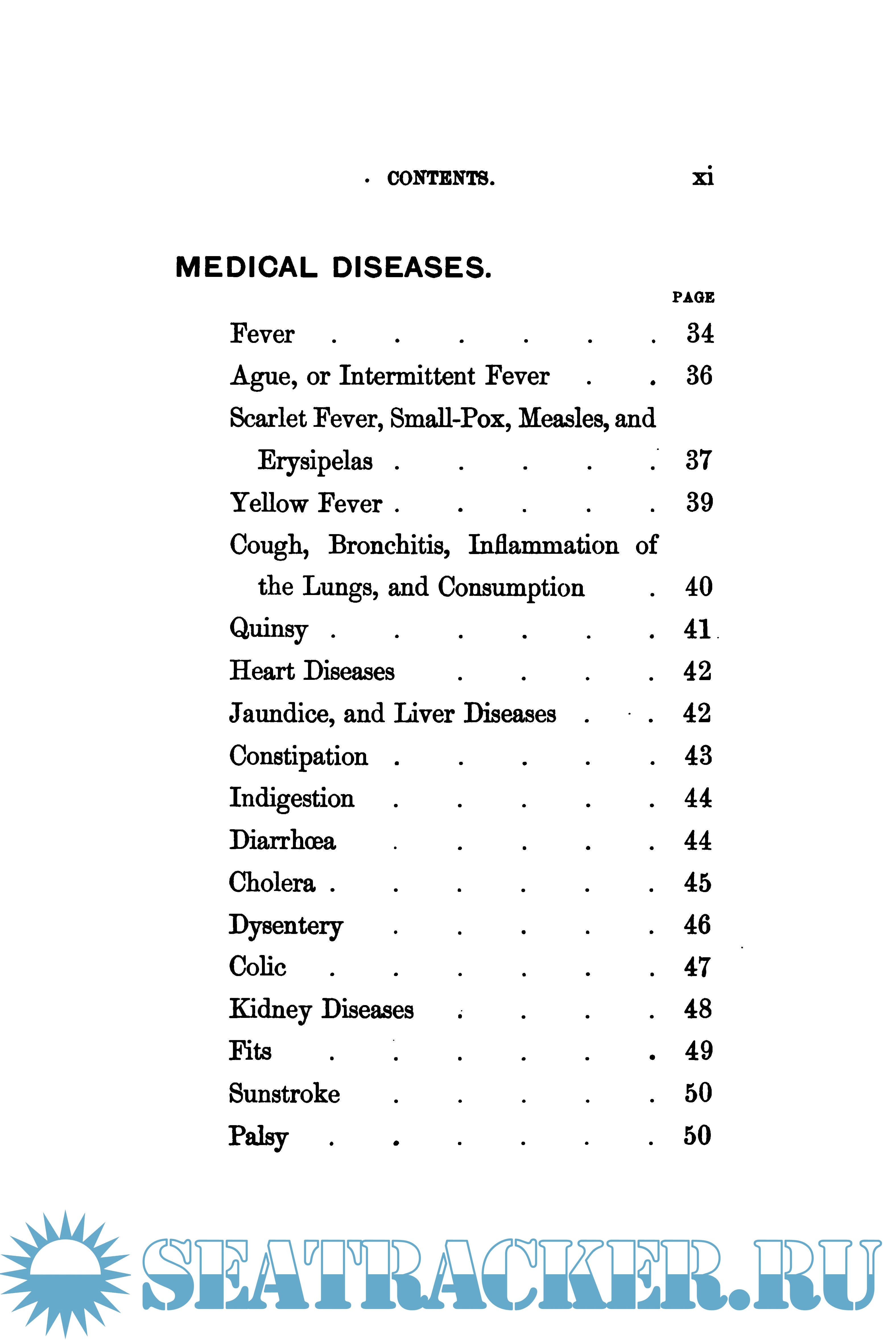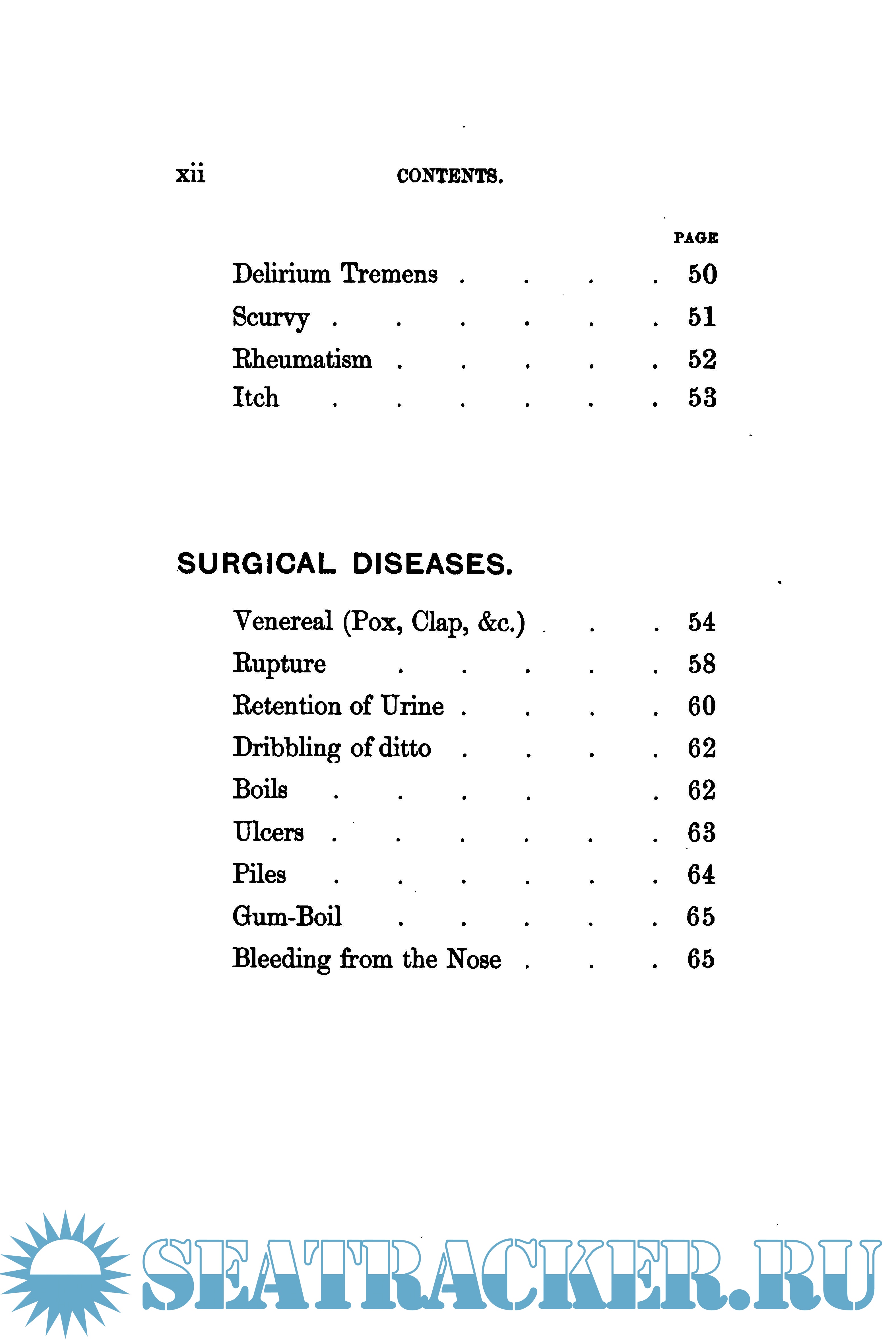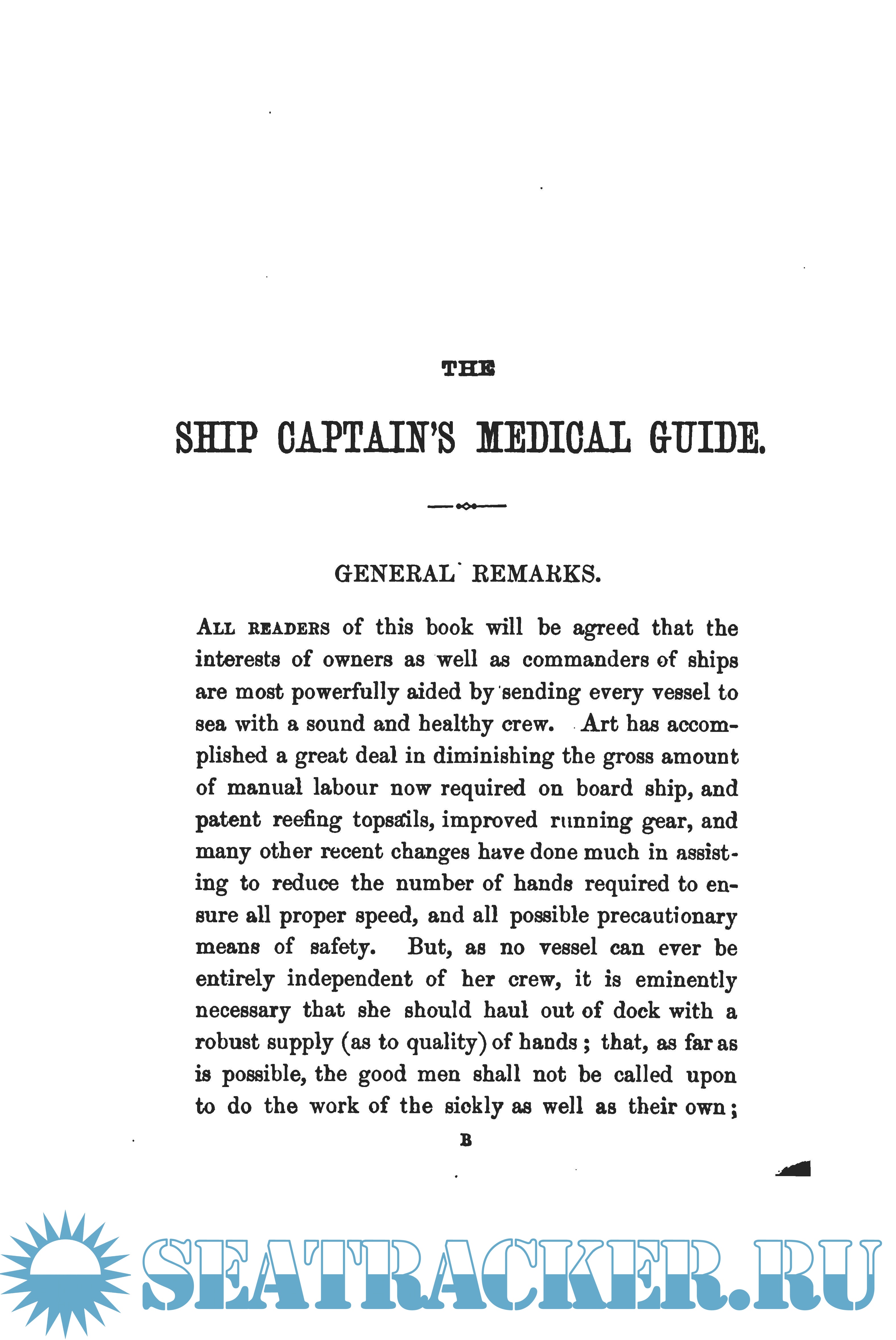 Year: 1868 Language: english Author: Harry Leach Publisher: Simpkin, Marshall | Oxford University Format: PDF Quality: OCR without errors Pages count: 120 Description: This work is written solely for the use of Masters and Mates of vessels at sea. It is confined strictly to a plain and brief description of accidents and diseases that occur on board ship; and much care has been taken to show, as clearly as possible, how these accidents and diseases can be best treated by a non-professional man. So little choice is given in the treatment of each malady, that the reader is urged to do absolutely all that is recommended, in the belief that no more than is here laid down can be accomplished safely without the assistance of a doctor. The compiler begs to offer many acknowledgments for the aid that has been so courteously afforded to him, and commends this book to the earnest attention of Commanders in the Mercantile Marine, hoping to receive from their experience suggestions that may tend to its completeness and consolidation.