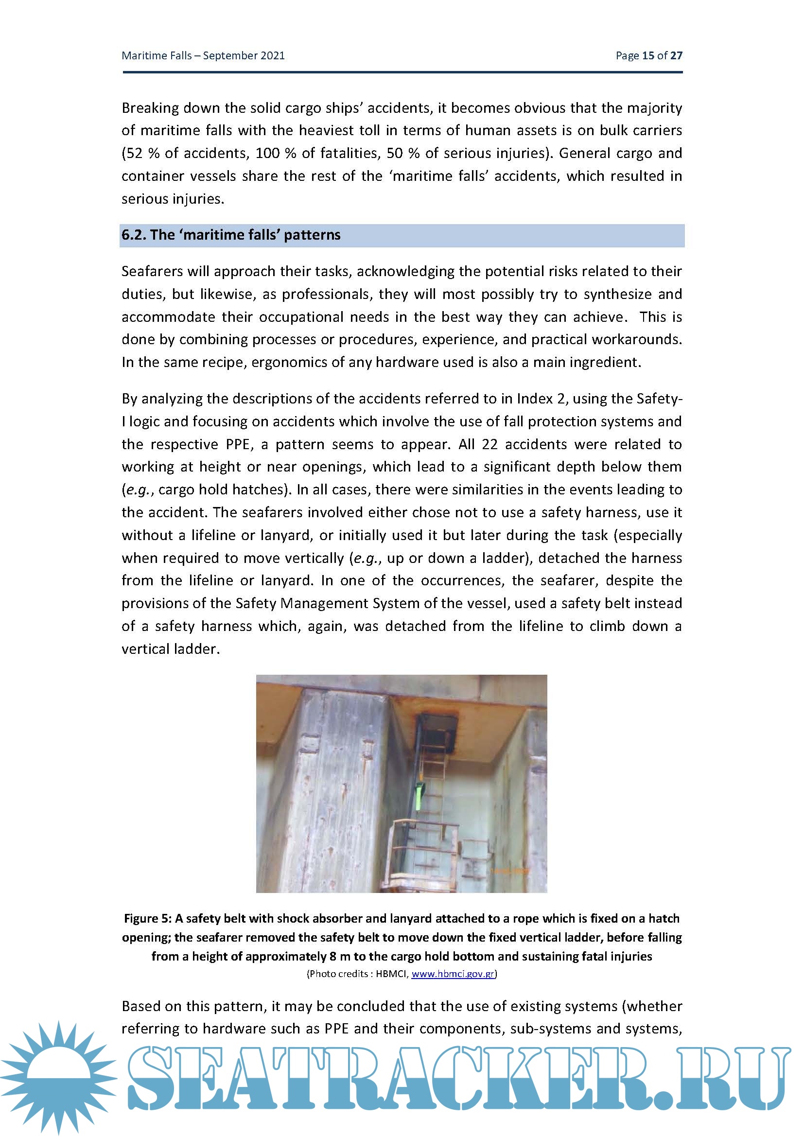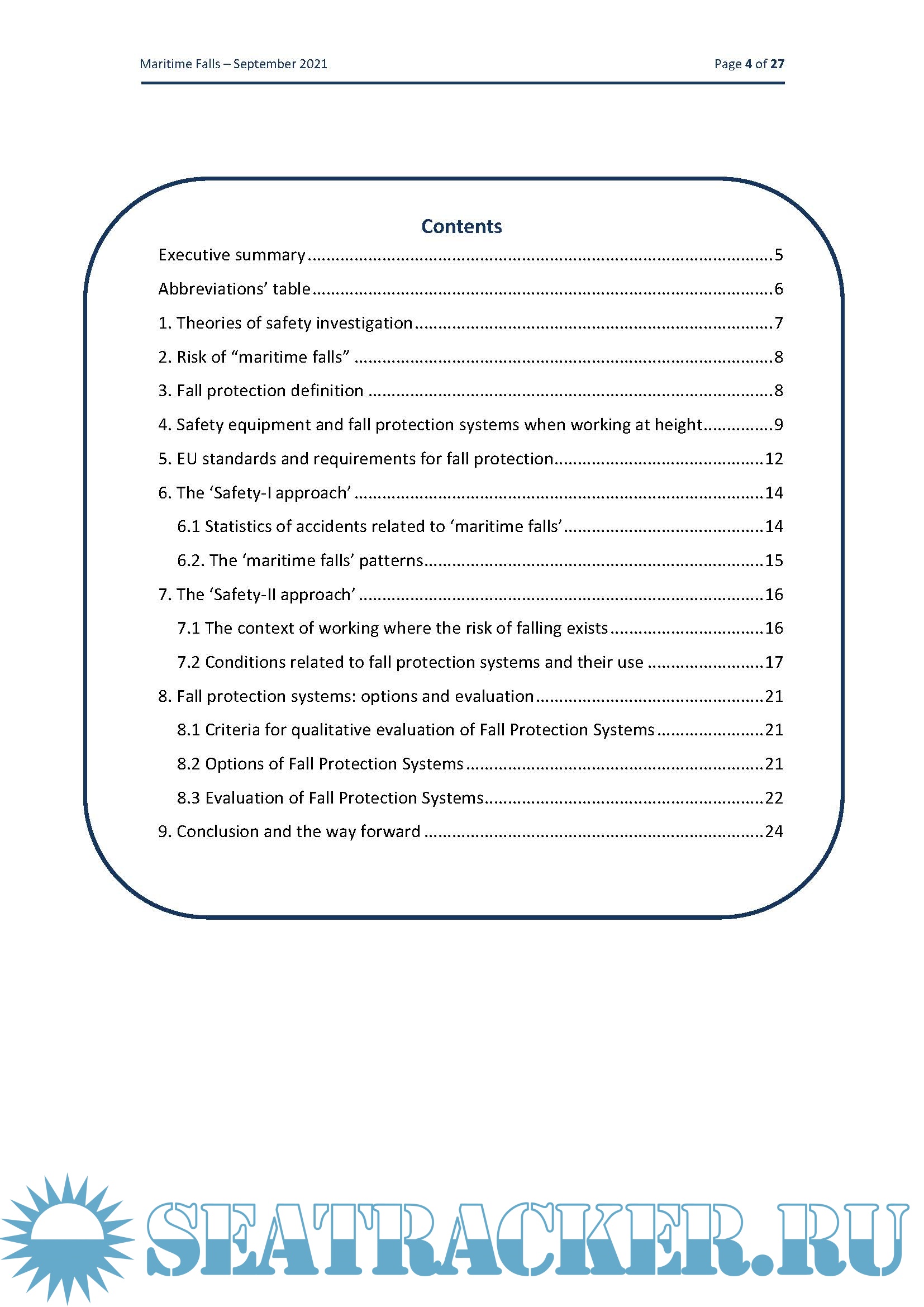 Description: This study addresses the issue of ‘maritime falls’ accidents, which include falls from height to a lower level, falls overboard, and being washed away by green seas. For the purpose of this study, fall protection is broken down to three ingredient modes (securing, restraint and arresting) and the existing relevant international and EU provisions on fall protection systems are presented, which allow for a variety of protection systems to be used in the marine industry.