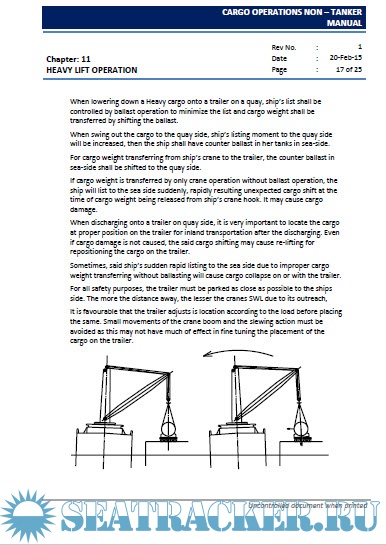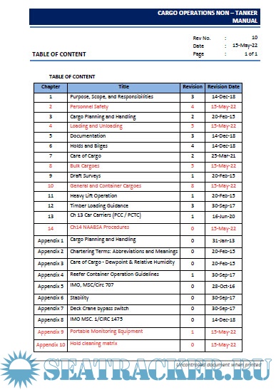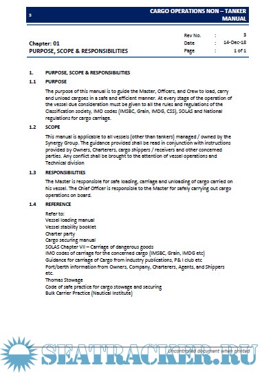 Description: The purpose of this manual is to guide the Master, Officers, and Crew to load, carry and unload cargoes in a safe and efficient manner. At every stage of the operation of the vessel due consideration must be given to all the rules and regulations of the Classification society, IMO codes (IMSBC, Grain, IMDG, CSS), SOLAS and Nationalregulations for cargo carriage.