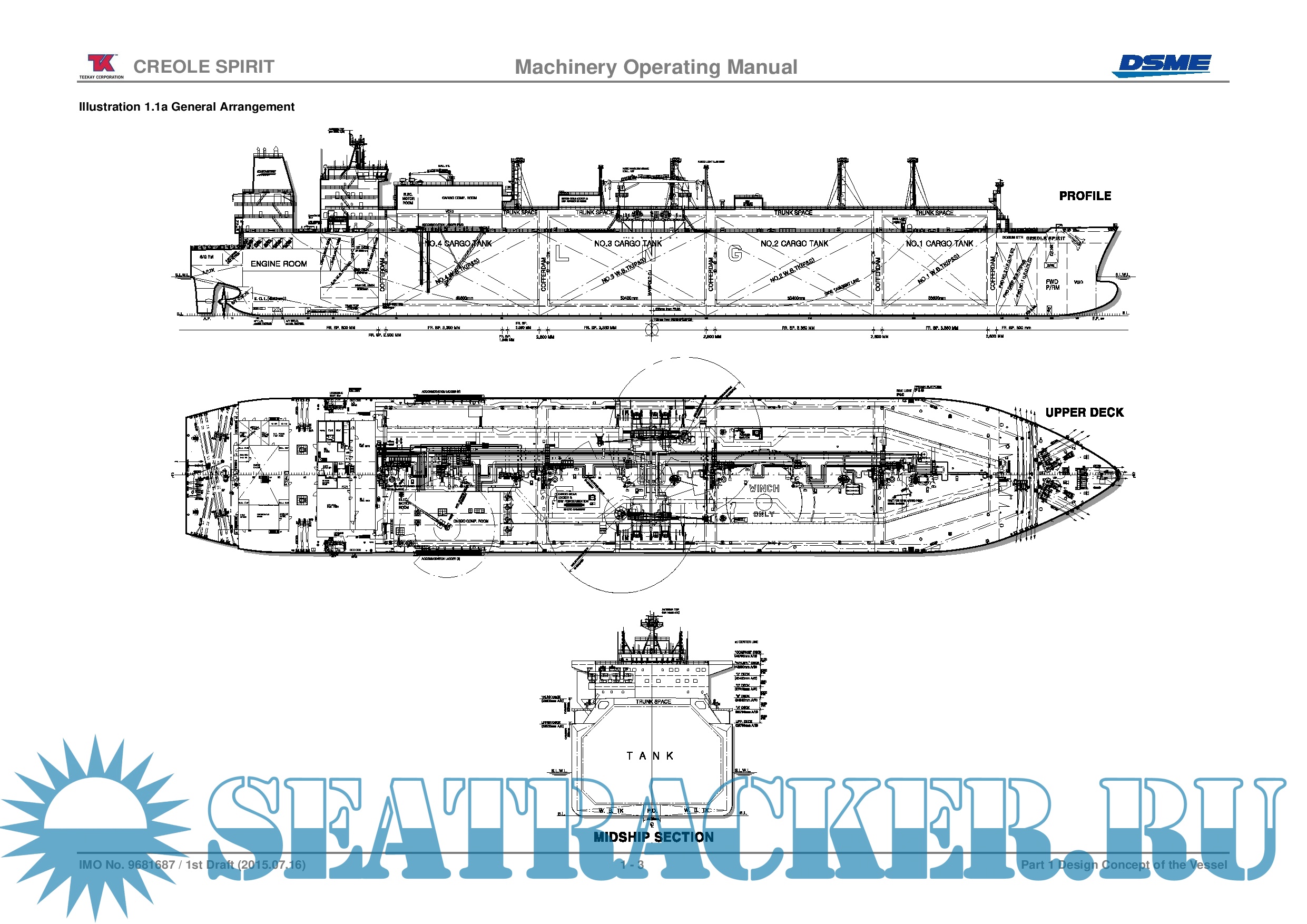 Year: 2015 Language: english Author: DSME Genre: Manual Format: PDF Quality: eBook Pages count: 308 Description: Shipbuilder: Daewoo Shipbuilding and Marine Engineering Co., Ltd. Okpo Shipyard, Republic of Korea Yard Number: 2407 Ship Name: CREOLE SPIRIT Delivered: 2015.10.28 Flag: Bahamas Classification: Det Norske Veritas - +1A1, Tanker for Liquefied Gas, Ship type 2G (-163°C, 500 kg/m3, 0.70 bar), NAUTICUS(Newbuilding), COAT-PSPC(B), E0 , NAUT-OC, TMON, BIS, CLEAN, BWM- T, GAS FUELLED Main Engines Type: MAN B&W 5G70ME-C9.2-GI x 2 set (Derated) - MCR: 12,520 kW x 69.1 rpm, each - NCR: 11,270 kW x 66.7 rpm, each Service Speed: 19.5 knots at design draft of 11.5m on even keel with main engines running at 90% MCR (22,540 kW) with 21% sea margin
