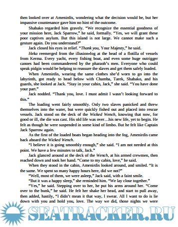 After making port in Africa, Jack is summoned by Cutler Beckett, who makes him captain of a ship called the Wicked Wench . Beckett gives Jack an assignment. He has heard a legend about a magical island named Zerzura whose labyrinthine bowels are said to contain a glorious treasure. Beckett suspects that one of his house slaves, a girl named Ayisha, is from Zerzura. He asks Jack to take her along on his voyage and seduce her into divulging the island’s whereabouts. In payment for his services, Beckett promises Jack a share of the treasure.