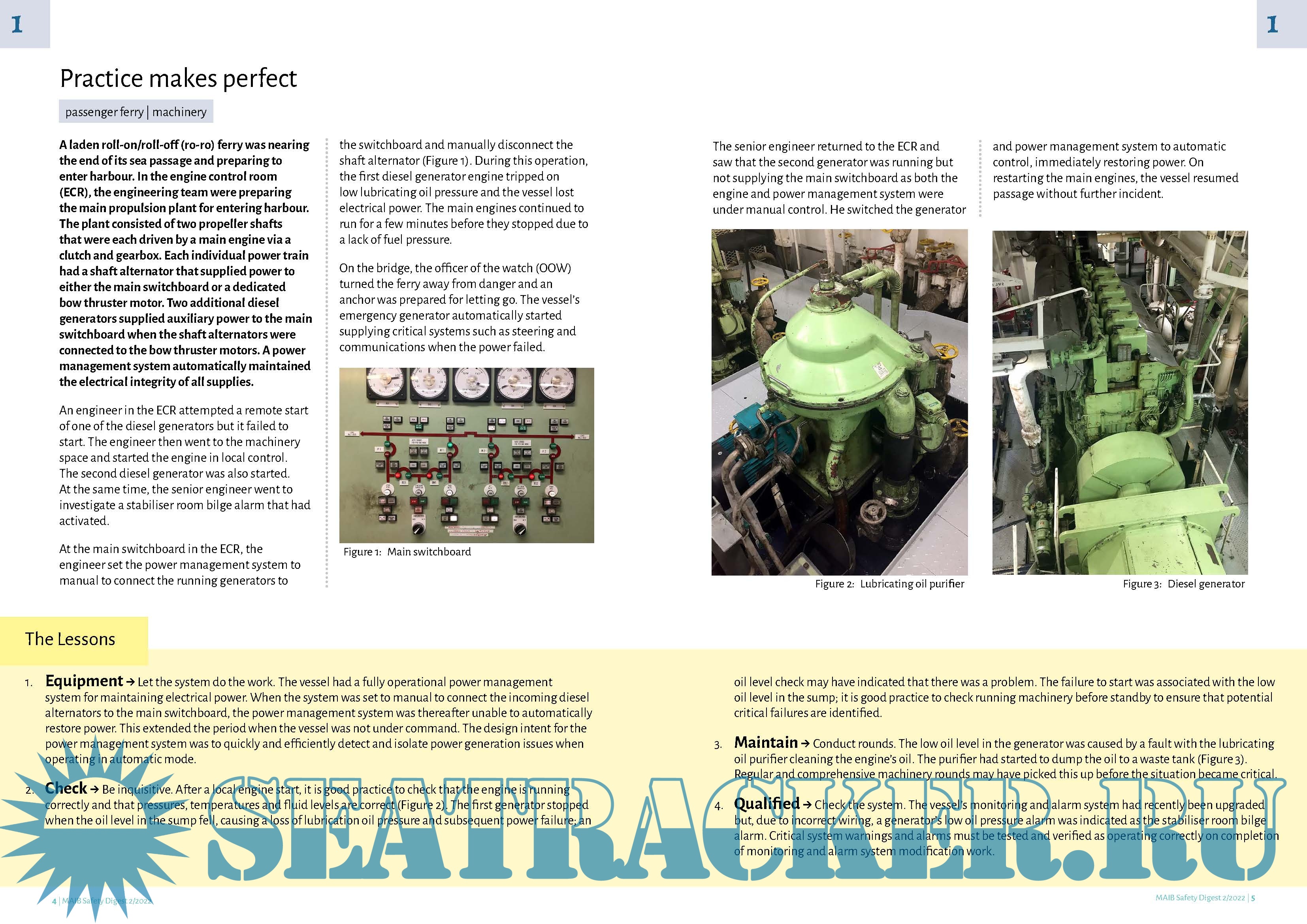 Year: 2022 Language: english Author: MAIB Genre: Research papers Format: PDF Quality: eBook Pages count: 72 Description: A new collection of cases (volume 2 of 2022) detailing accidents involving vessels fromthe merchant, fishing and recreational sectors. The Marine Accident Investigation Branch (MAIB) examines and investigates all types of marineaccidents to or on board UK vessels worldwide, and other vessels in UK territorial waters. This Safety Digest draws the attention of the marine community to some of the lessons arising frominvestigations into recent accidents and incidents. It contains information that has been determined upto the time of issue. Published October 2022